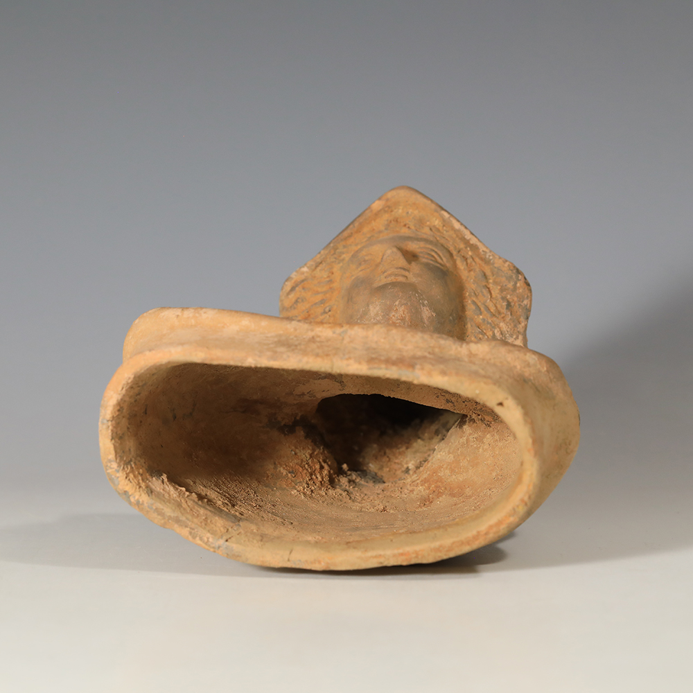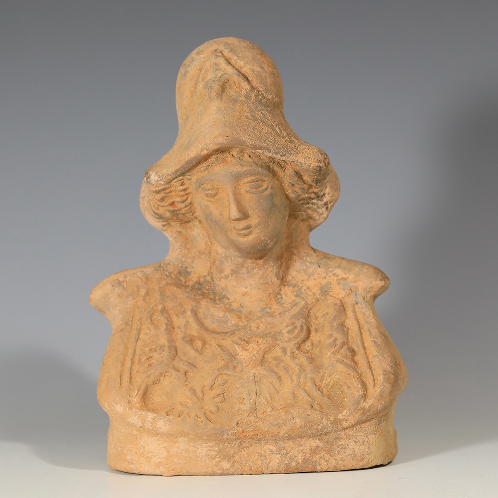 Terracotta statuettes such as this beautiful example, are the most common sculpture types found in Greek art, including across Hellenistic sites. They vary from simple crude figures to finely rendered creations. Although present in a variety of different circumstances, a common usage was as a votive offering in funerary and sanctuary contexts. Terracotta figures were cheap to make and easily replicable, making them well suited for this purpose. All Greek sculptural production was originally polychrome. Few examples of statues and statuettes have come down to modern times in their original condition with their polychromy intact.