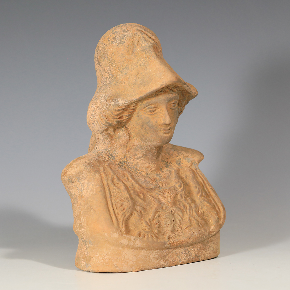 Athena was the goddess of wisdom, courage, inspiration, civilisation, law and injustice, mathematics, strength, war strategy, the arts, crafts, and skill, according to Greek religious beliefs. She wears a helmet, which is typical of Athena’s portrayal in the Greek iconographical tradition, and alludes to her prowess in war and to the idea that military strategy was in her domain. Similarly suggestive of these qualities is her cuirass (breast plate).