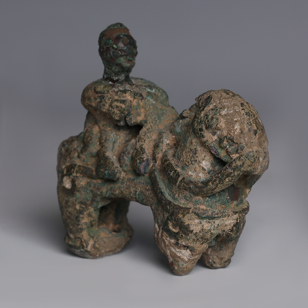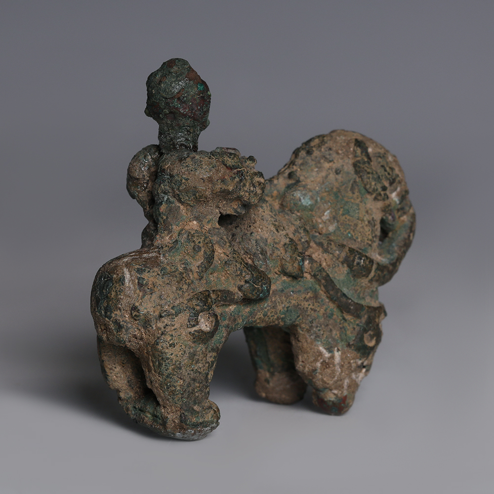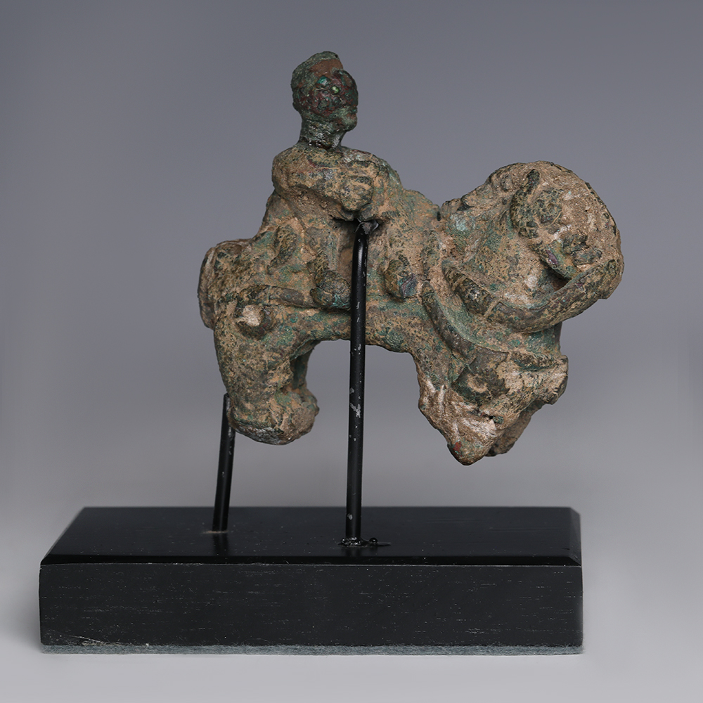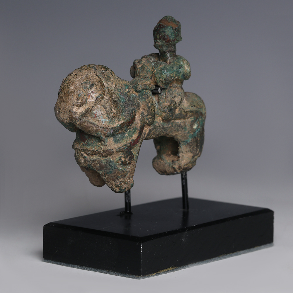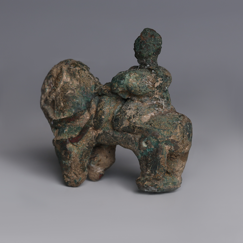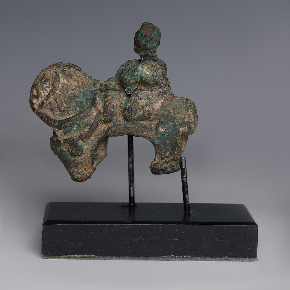 A finely cast bronze sculpture, depicting a male warrior riding a horse, displaying prominent stylistic features that are distinctively known to Hasanlu metal objects of the Iron Age. Both the zoomorphic and anthropological figures are portrayed in a naturalistic manner, with much attention given to the realistic renderings of the horse’s strong physique and anatomical details. The warrior is portrayed holding the harness and features incised facial detailing. The reins are presented by two ridges, slightly protruding from the surface.