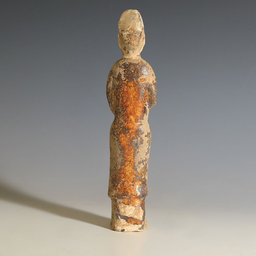 Grave goods were an important status symbol in ancient China, so the affluent and important would be accompanied in their travels through the afterlife with numerous depictions of people, items and animals. Such terracotta figures were made for the service and entertainment of the owner, ensuring that their journey in the underworld was a happy one. Terracotta tomb attendants seemed to have first appeared during the Western Han Dynasty. However, it is during Tang China that the cultural tradition of displaying wealth in elite tombs reached its peak, with an increased production of terracotta statuettes. Sancai-glaze technique, also known as Three-Colour glaze, is one of the great achievements of Tang pottery production. On figures rendered in sancai technique, faces were often left unglazed, as the consistency of the glaze itself made small details difficult to render. The unglazed faces would have been then painted after firing, allowing more precise details.