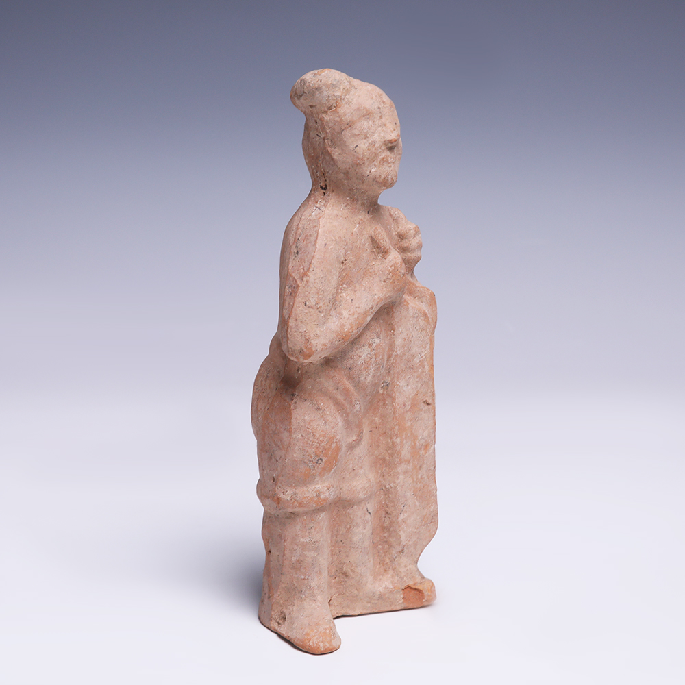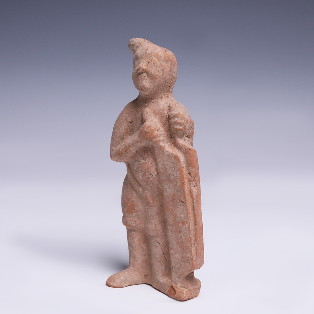 A terracotta figurine of a male farmer dating to the Eastern Han Dynasty. He is portrayed in a standing pose and holding a large item, possibly a sickle, to his side. He wears the qujupao (曲裾袍), a traditional Han Dynasty dress comprising of a mid-length outer garment with wide sleeves and a tapering hem. His hair is coiled atop the head in a typical Han male hairdo, leaving his face bare and revealing his facial features. The prominent nose and plump lips remain well defined, whilst the faint eyes and thick arched eyebrows exude a sense of serenity.