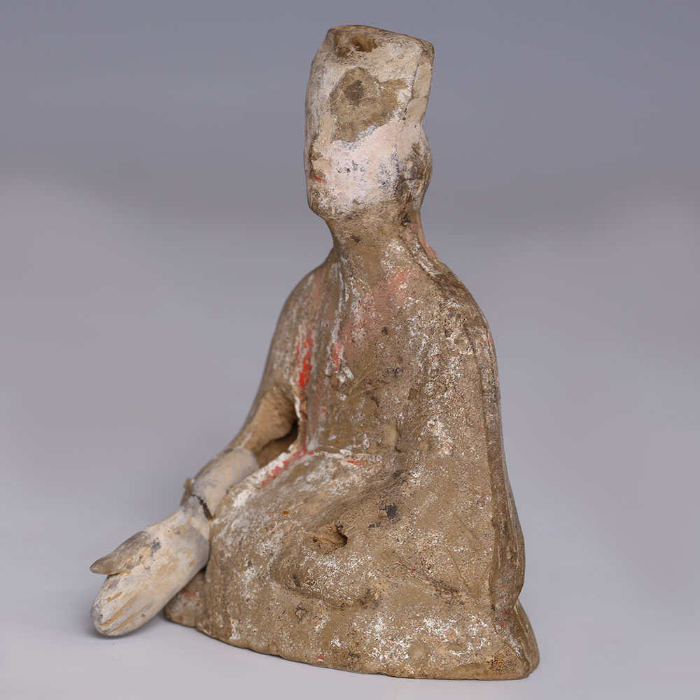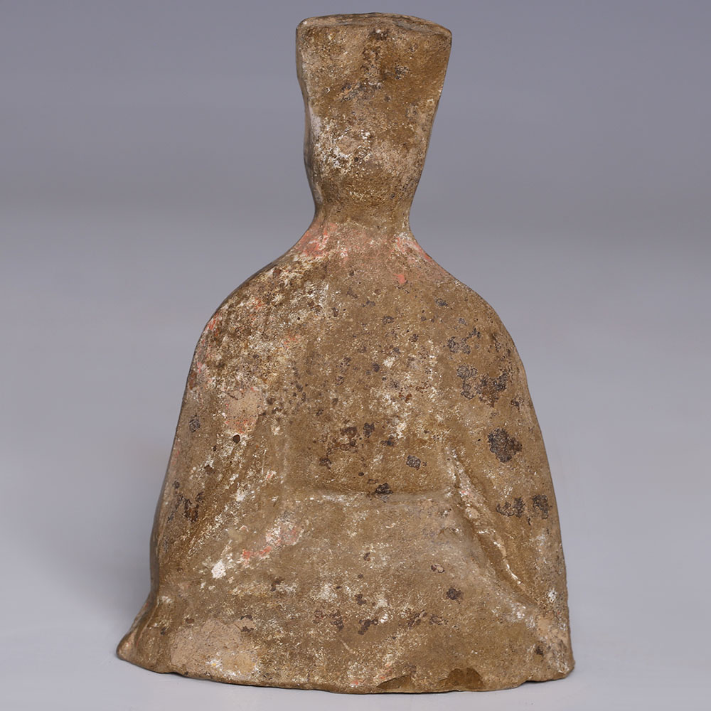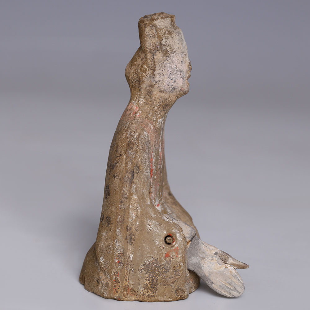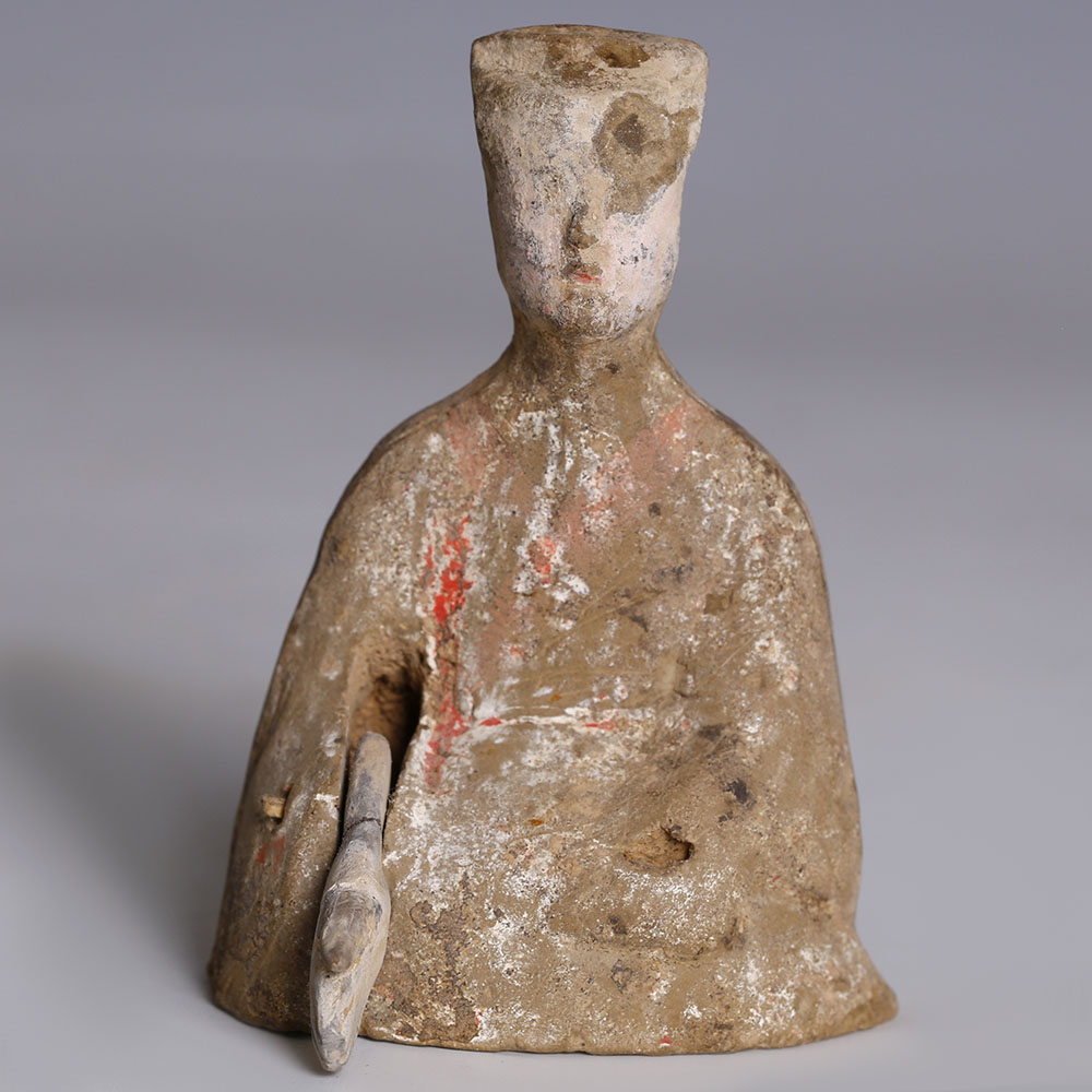 The Han Dynasty was the second imperial dynasty of China (206 BC–220 AD), and its art is notable for aiming to give form to everyday people and objects. It was a period of significant economic growth, and this facilitated discovery and innovation: technical possibilities in the arts increased as a result, enabling artists to push boundaries. The art of the Han dynasty is largely decorative, a shift away from the functional, ritualistic art of the previous Qin dynasty. This statuette was likely a ‘mingqi’, a burial figurine, viewed as a sort of utensil for the afterlife, and usually depicting everyday objects and people, like dancers, court attendants, and servants. Mingqi figurines of dancers and musicians would have been placed in the tomb with the deceased to ensure company and entertainment.