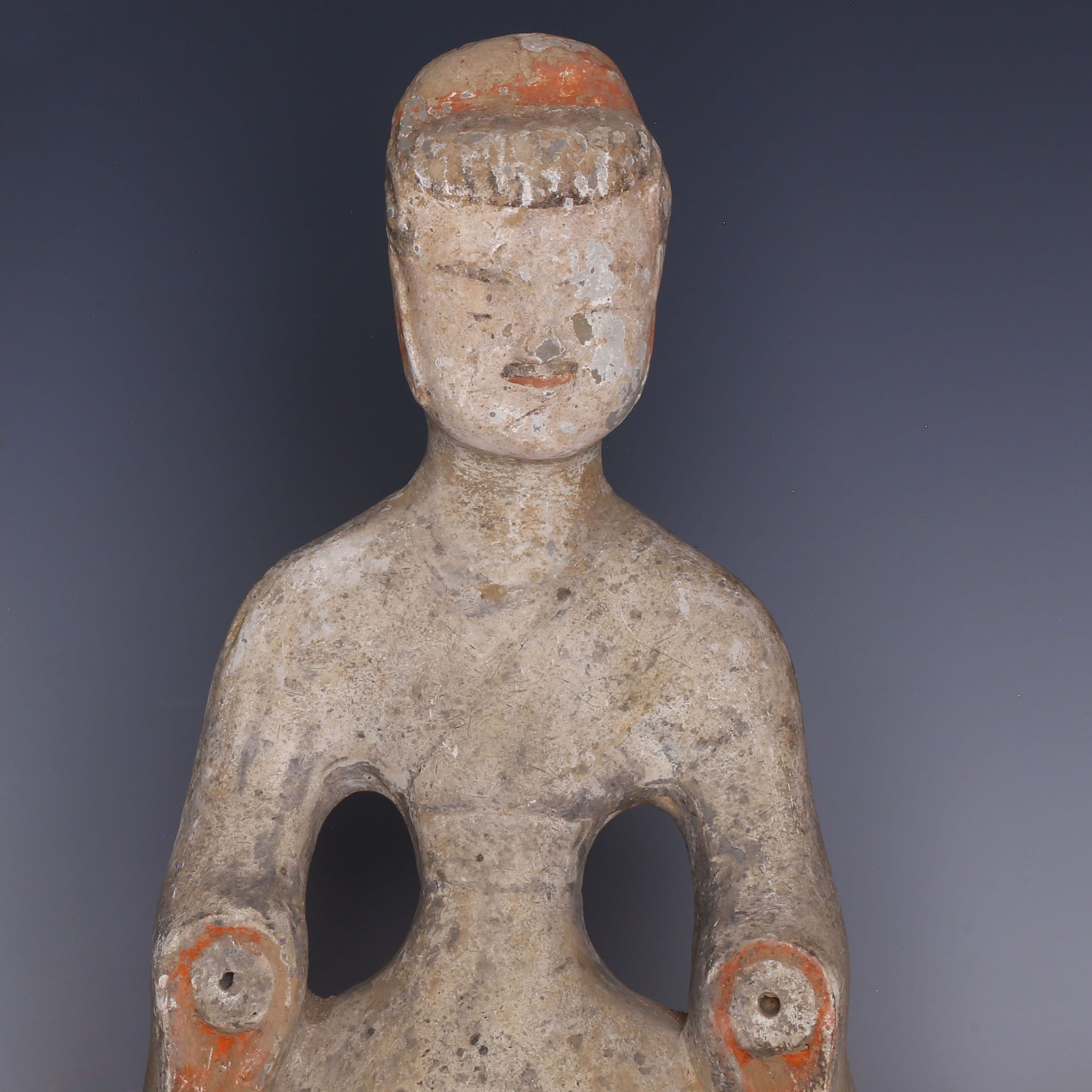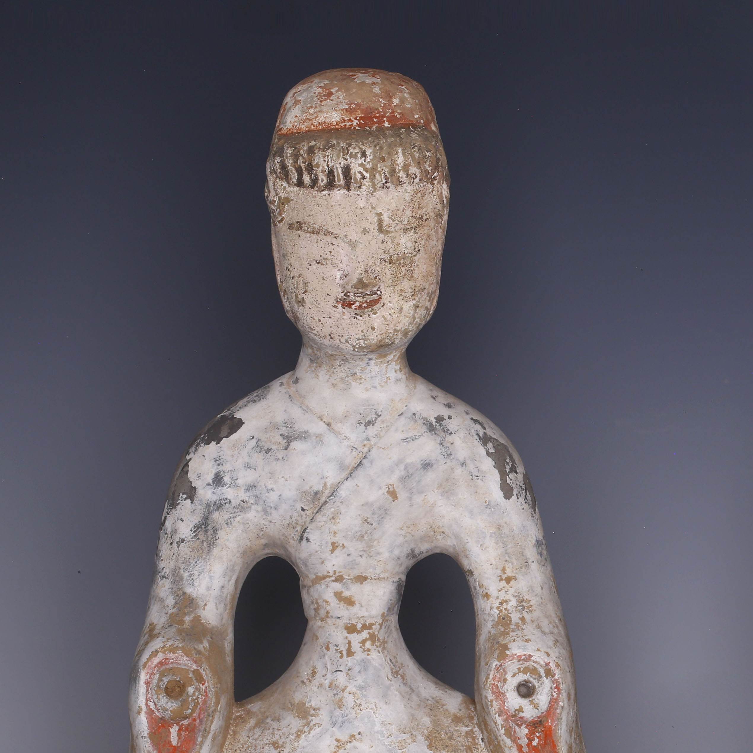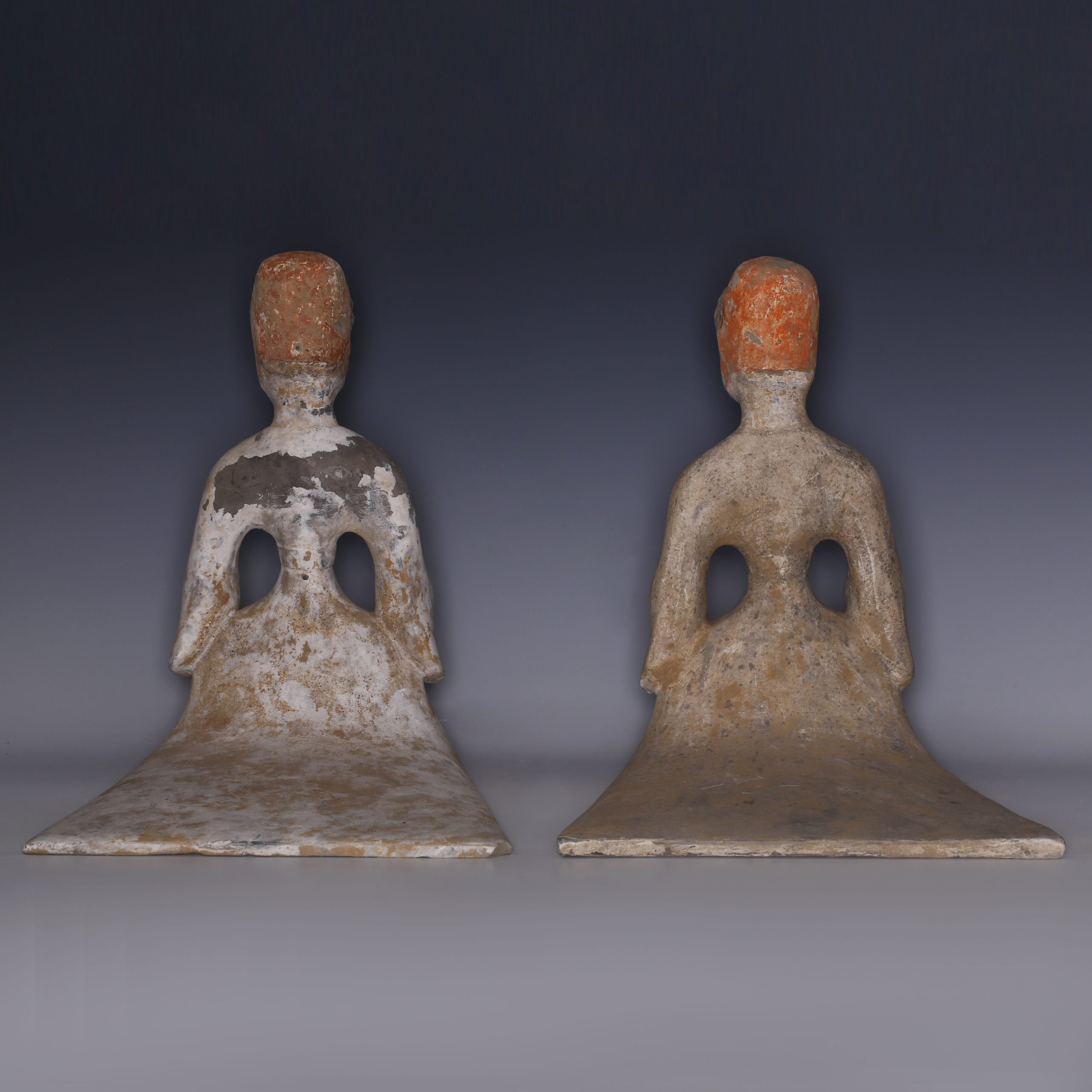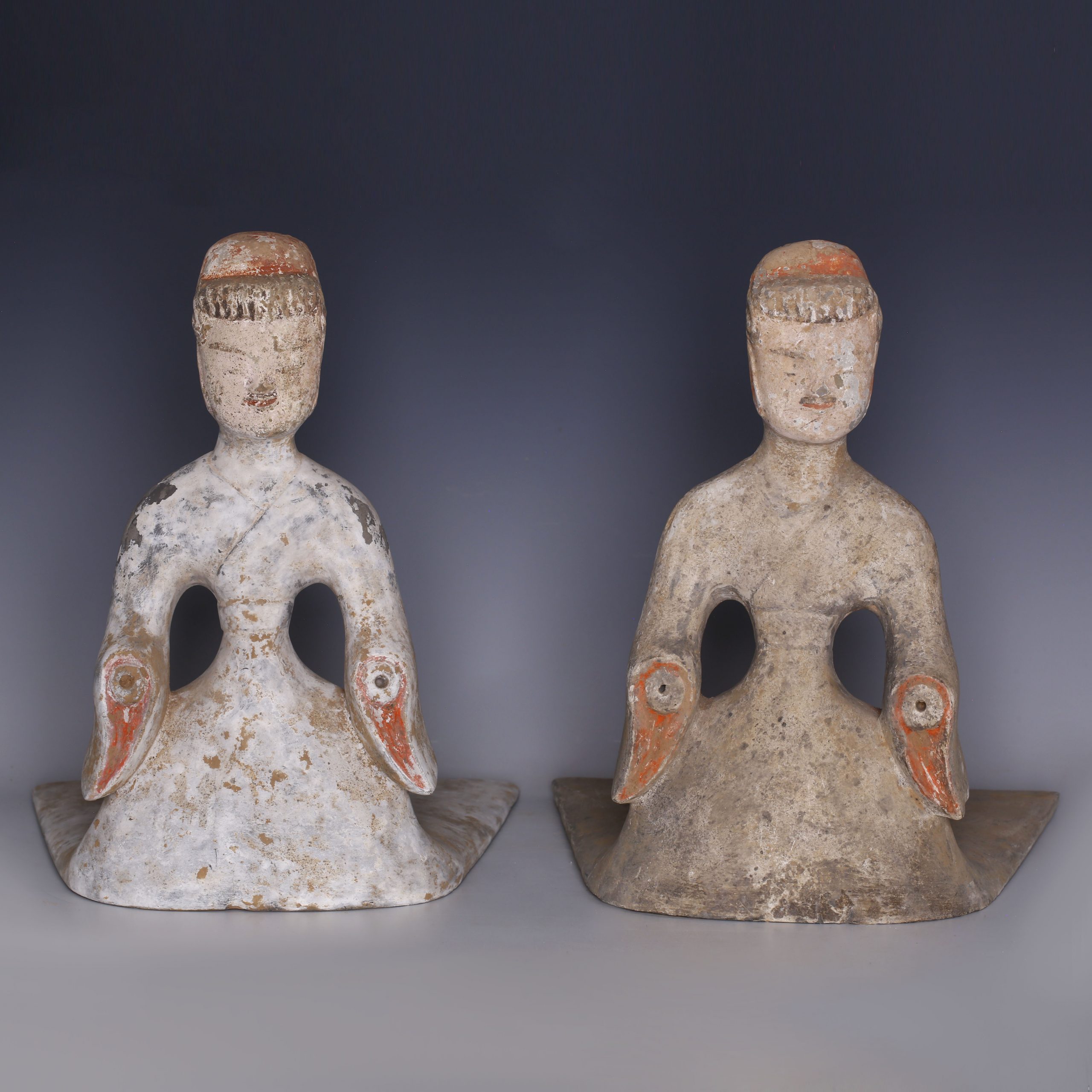 A finely modelled hollow-moulded identical pair of Eastern Han Dynasty court ladies, portrayed in a kneeled position, with arms outstretched frontally, as in holding an object. The figures are presented wearing the traditional Eastern Han Dynasty court attire, known as shenyi, consisting of a long vest, tied to the waist and long, flaring sleeves, revealing a bright orange undergarment. The hair of both figures is arranged in a high bun, covered by an orange cap. Facial features, such as eyes and eyebrows, are rendered through a delicate black paint, while the lips are painted in bright red. The original white, orange and brown pigments would have been applied to the figurines after firing, with the result that the paint would have been more prone to flaking. The figures’ arms appear missing the detachable hands, which in antiquity would have been supporting offering or incense sticks.