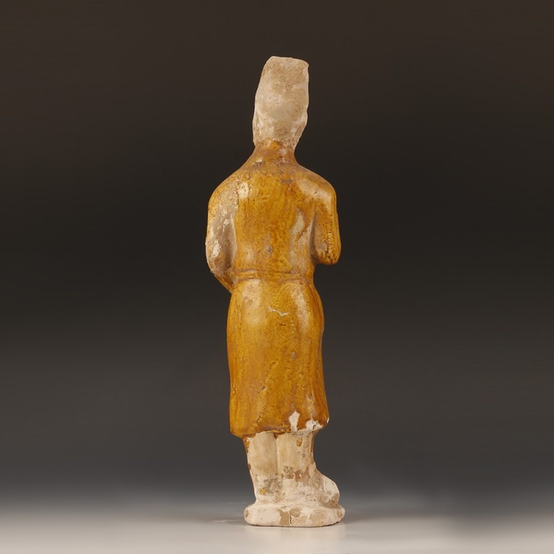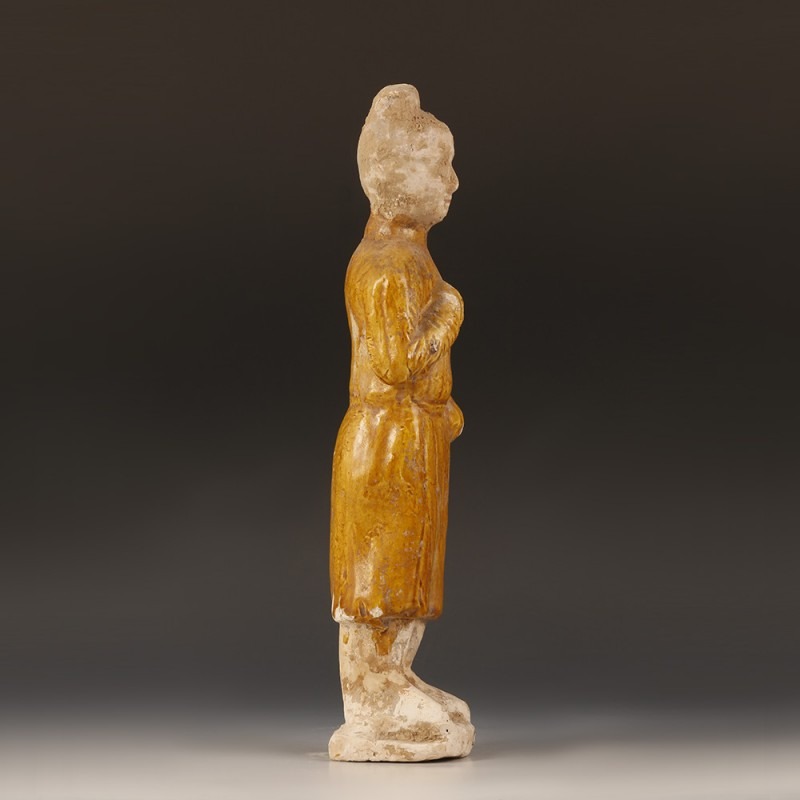 A hollow-moulded cream clay terracotta figure of an attendant. The body boasts an extensive and rich mustard-coloured glaze; and the facial details retain their original black and red pigments (which are worn but visible beneath earthy encrustations).