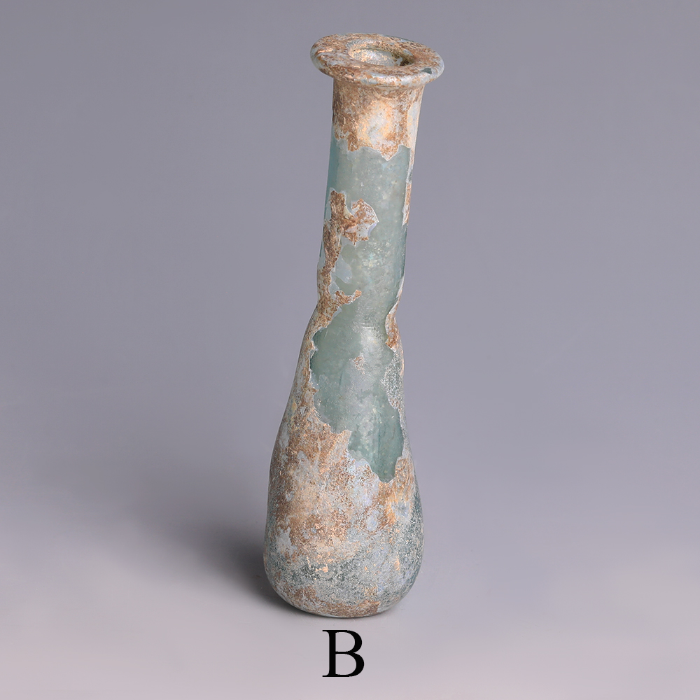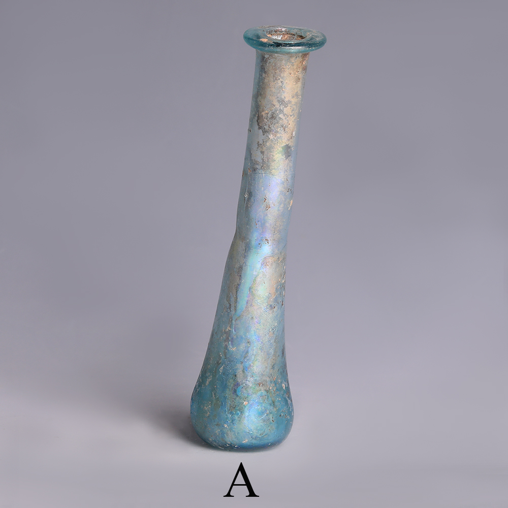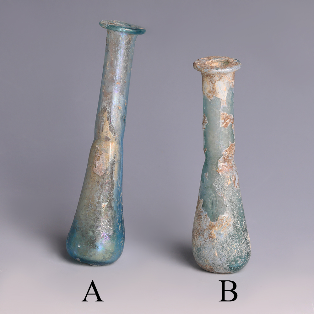 A selection of ancient Roman glass unguentaria, probably used to contain ointments (unguent), medicine, cosmetics or perfume. Both vessels feature a narrow conical body tapered gently at the shoulders, a long narrow cylindrical neck and a small out-sprayed flat rim. The vessels sit upon slightly concave bases.