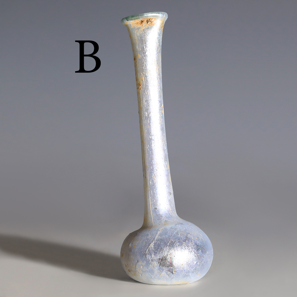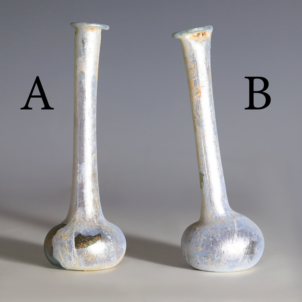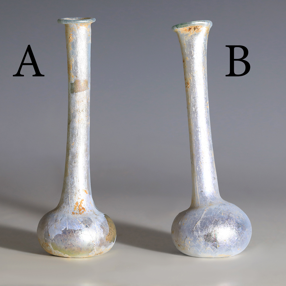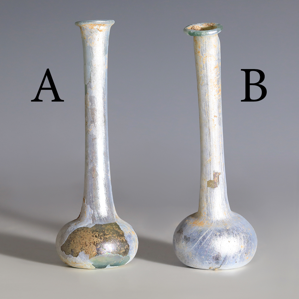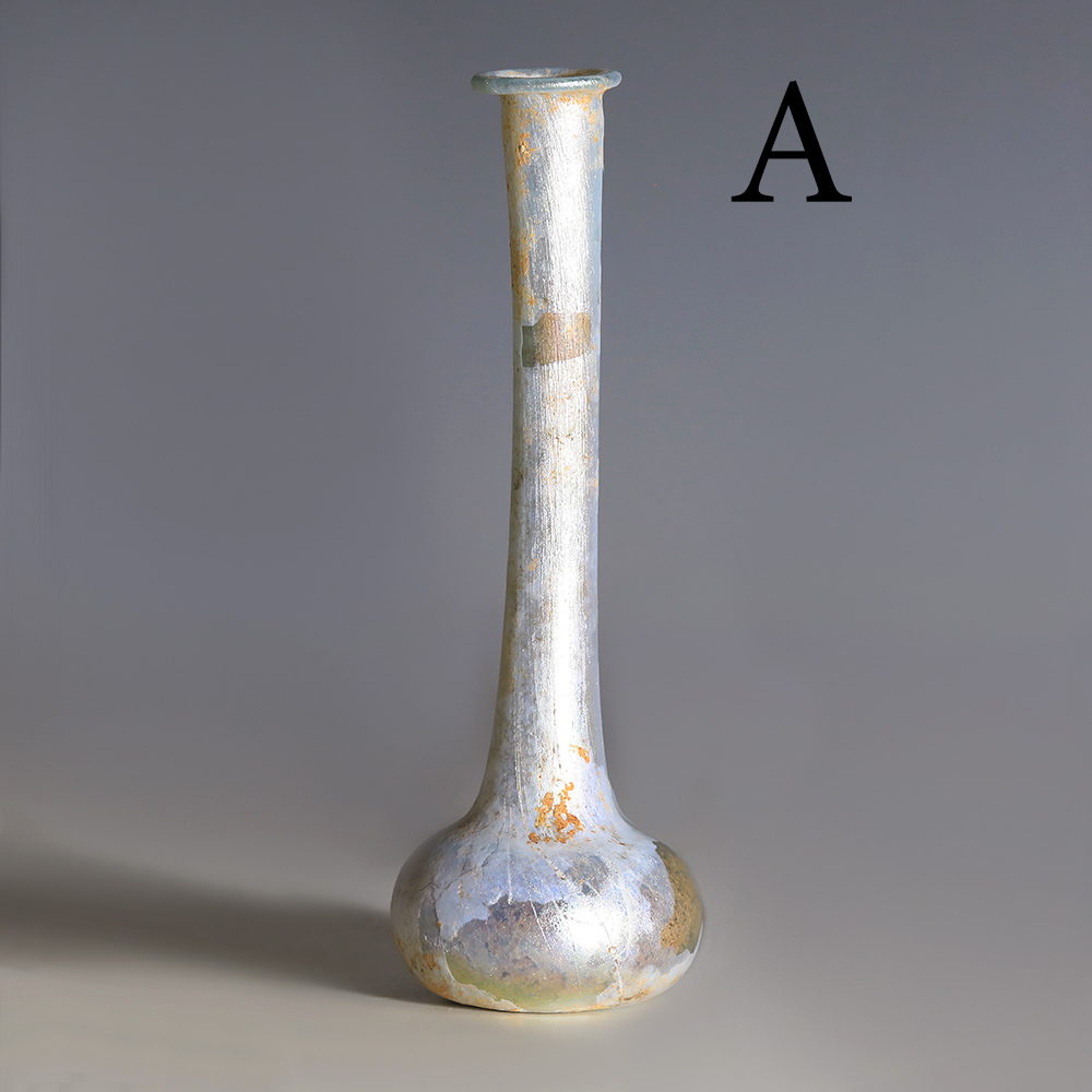 Unguentaria were amongst the most common objects of Roman blown glass: produced in large numbers, they were items of everyday use for keeping expensive perfumes and cosmetic oils. The small body and mouth were ideal for slow, careful pouring, while glass was preferred for holding liquids, due to its non-porous, non-absorbent nature. ‘Candlestick’ unguentaria are so named for their elongated neck and were especially used in funerary and burial rituals, hence their frequent occurrence in archaeological excavations of ancient cemeteries.