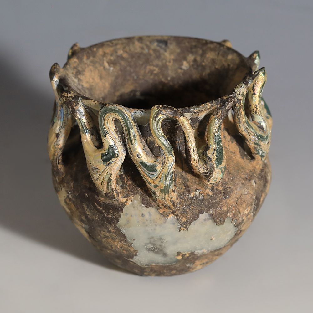 By the 1st century AD, the technique of glass-blowing had revolutionised the art of glass-making. The new technique allowed craftsmen to use smaller amounts of glass for each vessel and obtain much thinner walls, so enabling the creation of small medicine, incense, and perfume containers in new forms. New shapes allowed greater control over the liquid dispensed, and glass was the material of choice for storing the oils because it was not porous. These small glass bottles are found frequently at Hellenistic and Roman sites, especially in cemeteries, and the perfumes which filled them would have been gathered from all corners of the expansive Roman Empire. Jars, such as this piece, were made through the glass blowing process, which involved using a hollow clay or metal tube to gather molten glass into a sphere. By blowing air inside it, the glass worker created a hollow sphere, which would have been then stretched with the aid of gravity and metal tools into the desired shape. The trailing on this piece would have been achieved by a single piece of molten glass, carefully administered – or ‘trailed’ – across the piece and adjusted with tweezers.