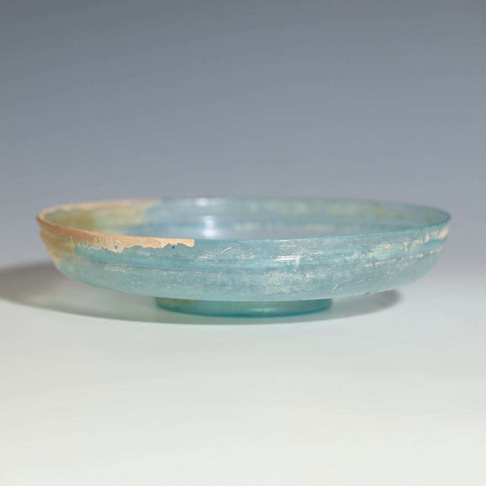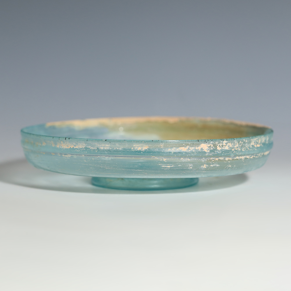 Glass became very popular across the Roman Empire, especially after the discovery of glassblowing in which production rates rapidly increased to match the level of demand. Glassblowing not only allowed for a wider range of styles and shapes to be produced, but the translucency of the glass became more achievable. This method revolutionised glass production, thus changing the everyday trends, people became more favourable of glass cups rather than pottery ones. Two different trade businesses were involved with the manufacturing of glass, glassmakers and glassworkers. The glassmakers would melt down glass and when cooled, it would be broken into chunks and shipped to glassworkers. Once receiving the glass, the glassworkers would mould it into the desired vessel/object. The function of these objects varied in everyday life, smaller bottles such as unguentaria would hold essential oils and perfumes while larger vessel, like this dish, would be used as tableware vessels. Glass vessels were also used for storage, merchants would pack different food products and goods in them and ship them overseas.