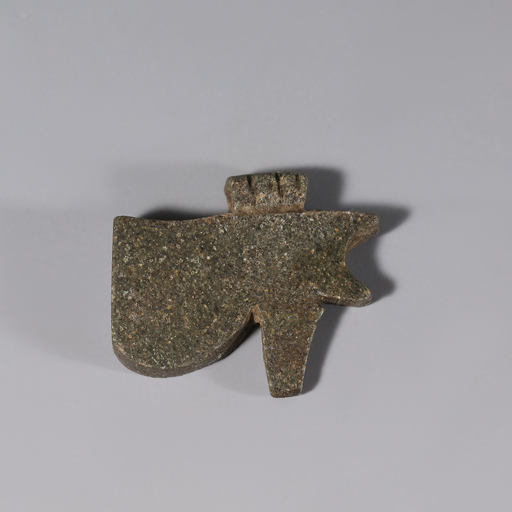 An Egyptian amulet depicting a wedjat, or Eye of Horus, carved from black hardstone. The surface on both sides of the amulet is smooth and unadorned. The amulet features the typical silhouette, combining human and falcon ocular imagery. The top horizontal line represents the brow, and the sloping protrusion beneath depicts the corner of the almond-shaped eye. The vertical rectangle beneath the eye represents the cheek mark, from which the amulet curves to a flat end. The amulet is pierced through the ribbed rectangular protrusion at the top.