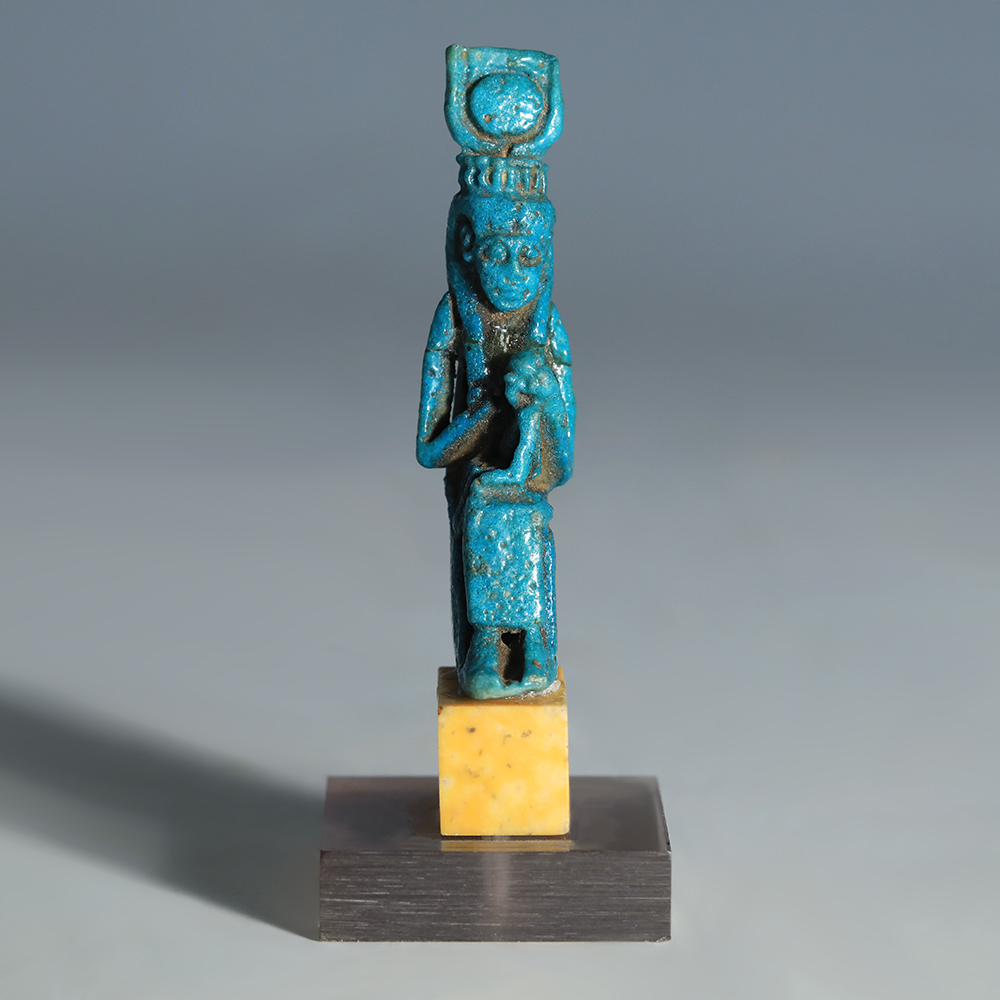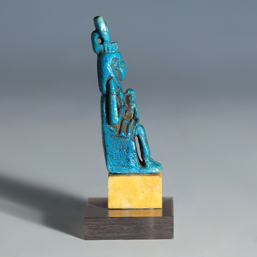 Isis holding Horus was a common motif in ancient Egyptian art. Isis was a goddess associated with motherhood, magic and protection. Her son, Horus, was the falcon-headed god of the sky, sun, and kingship. They are both part of the Osiris myth, in which Isis resurrected her murdered husband, Osiris, for long enough for Horus to be conceived. Isis protected and nurtured Horus until he was old enough to battle Seth, his father’s murderer, and claim his birthright to the throne.
