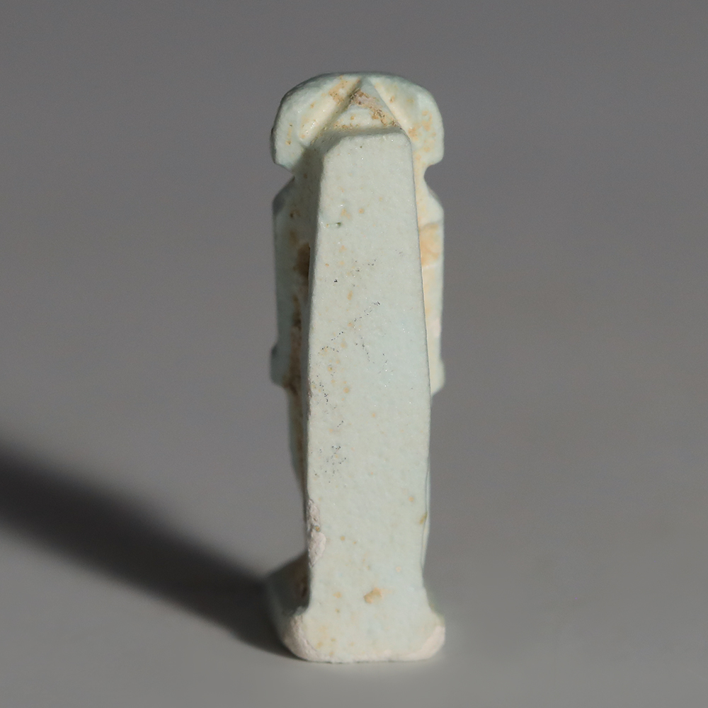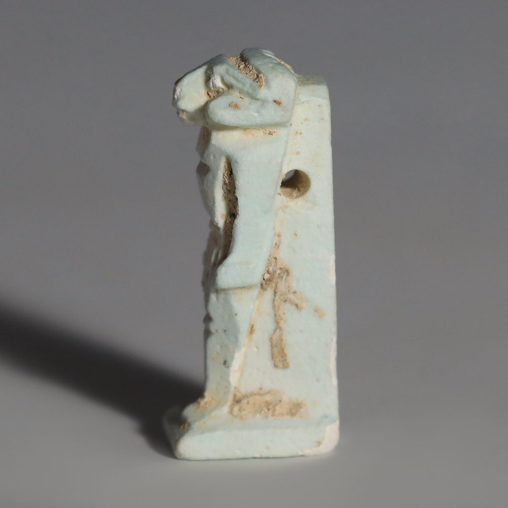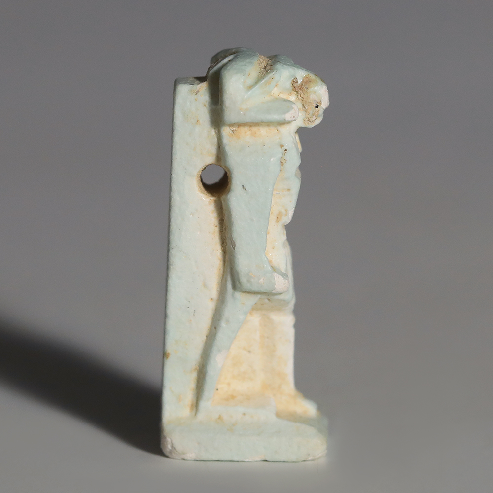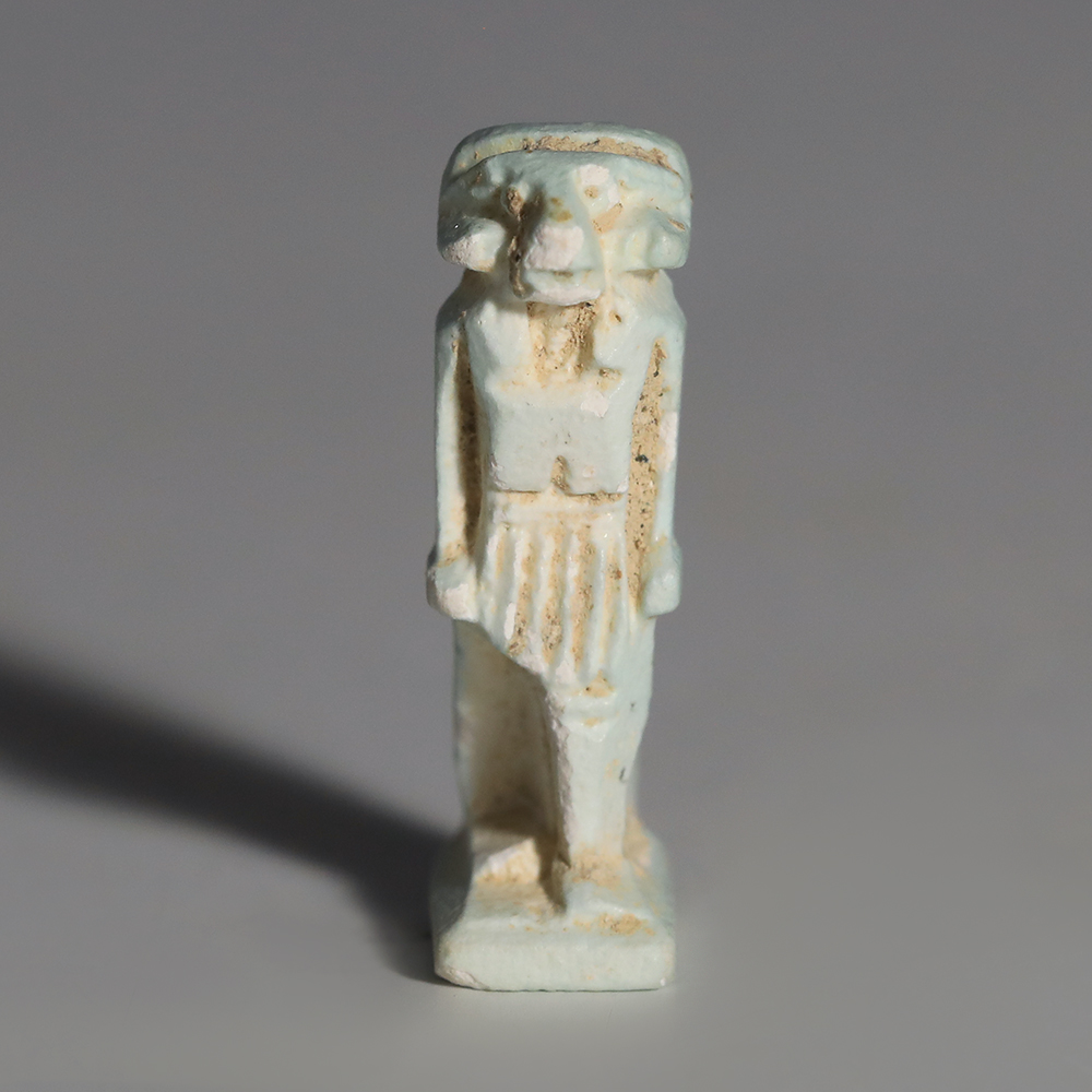 Khnum is most frequently depicted with a ram’s head, as he is in this example. He was one of the earliest deities to be celebrated in Egypt, and was originally the god of the source of the river Nile. He was also a god of birth and creation, as it was believed that Khnum made babies out of clay, using his potter’s wheel, and placed them in their mother’s wombs. The river Nile, rich in nutrients and good soil, was a wonderful source of life and sustenance. Khnum was therefore known as a protector and guardian, especially in relation to children – hence the choice for his depiction on an amulet.
