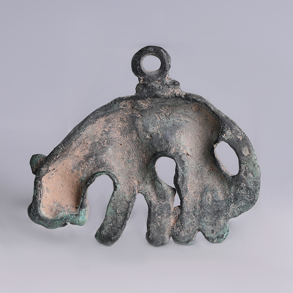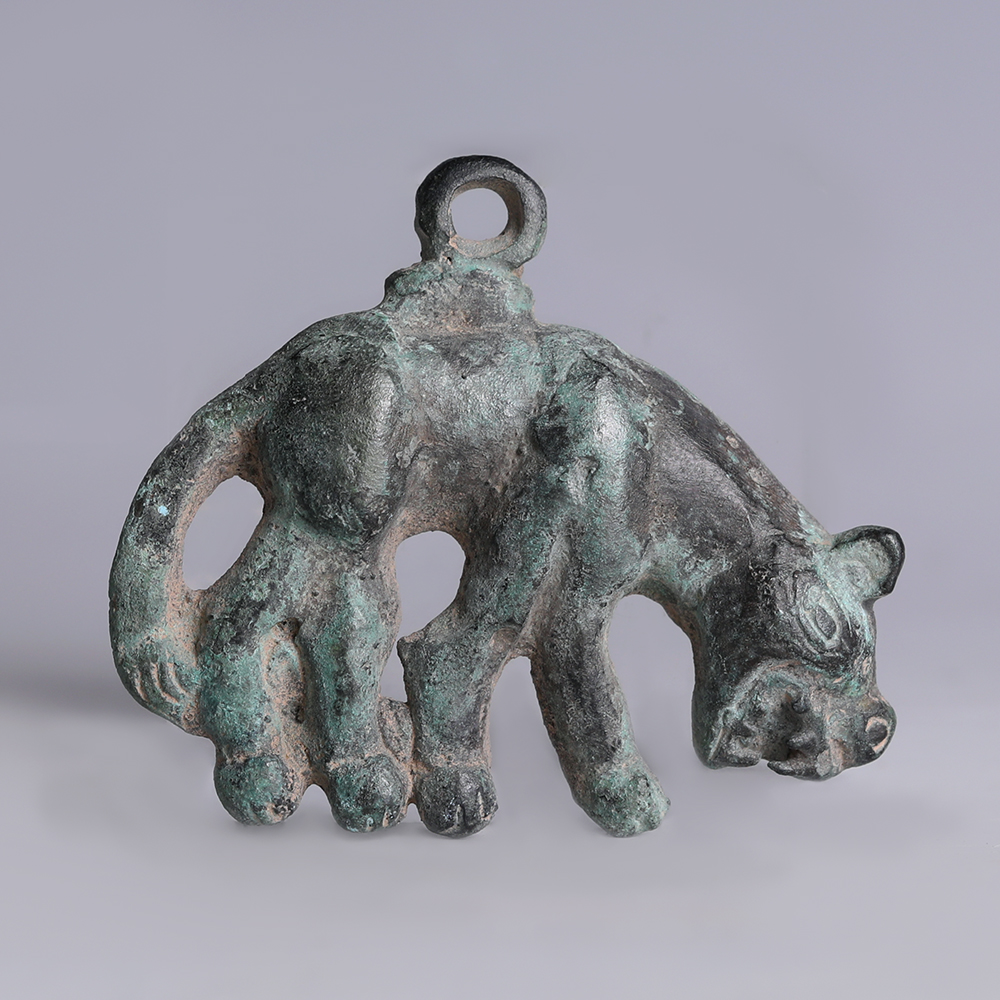 A finely cast Ordos bronze pendant plaque depicting a snarling panther. The panther is depicted standing, with its back slightly arched. Its head is lowered to the ground, echoing its drooping tail. Emphasis is placed on the strong muscular form of the animal’s powerful legs and neck through the use of raised casting. Its facial features are clearly depicted, including an almond-shaped eye, a circular nostril and a gaping mouth, in which its teeth are meticulously sculpted. A bronze loop is cast on the top, suggesting it might have been worn as a personal ornament.