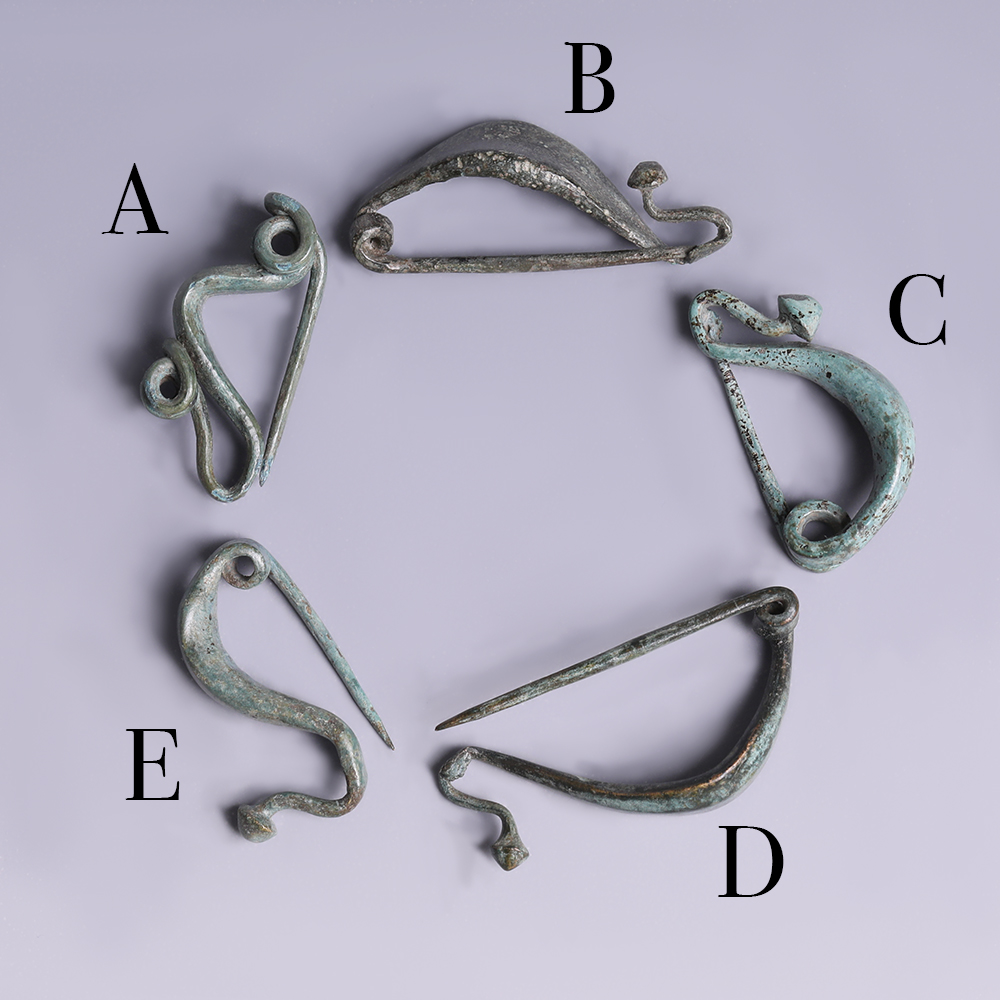 A selection of well-preserved Celtic La Tène bow fibulae, cast in bronze. Each feature a highly arched bow leading to a bilateral spring with a complete and intact pin. The foot, connected to the catch-plate, extends back on itself and ends in a protruding knob, expect A which displays a curved spring nature.
