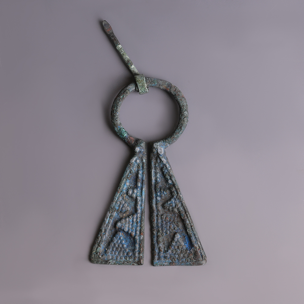 A bronze Viking omega penannular brooch, featuring two trapezoidal plate finials each with a granulated geometric design. The granules have been placed to form different sized triangles framed by a row of further granules. At the top, a free-moving pin sits vertically down the diameter of the brooch’s ring coiled to the hoop. The brooch features a flat, unworked reverse. Parts of the original bronze colouring can be seen on the back along with beautiful blue and green patination.