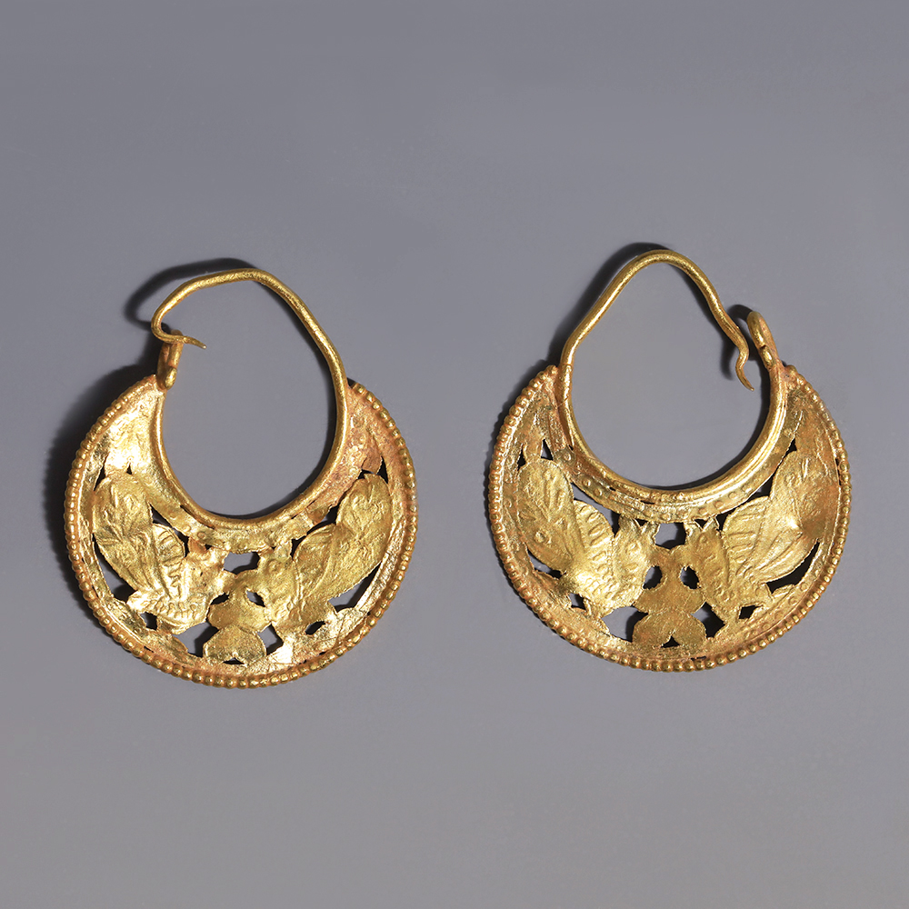 Byzantine jewellery was a continuation of Roman traditions. As in many other cultures throughout history, Byzantine jewellery acted not only as an embellishment, but most importantly as a direct display of someone’s wealth and social status. Interestingly, it also acted as a diplomatic tool. The earring with composite pendant was the most common type of ear ornament during the Byzantine Empire. ‘Opus interrasile’ was a technique used by goldsmiths to make elegant jewellery from the third through to the tenth century AD. Designs were traced onto sheets of gold and the background was punched with holes of various sizes to highlight the pattern, with fine details then worked on the surface. The patterns formed by piercing the metal encouraged the play of light and shadow across the object’s surface. This technique was very popular during the Roman empire, and was used by the majority of jewellers in the Byzantine empire.
