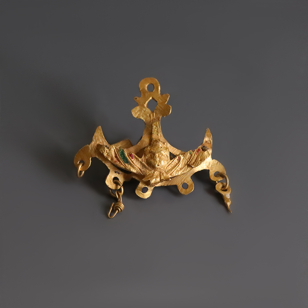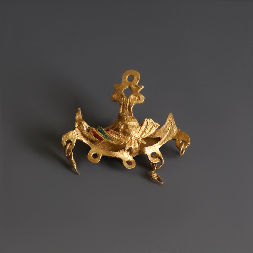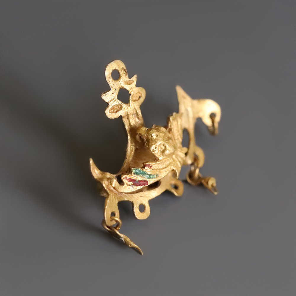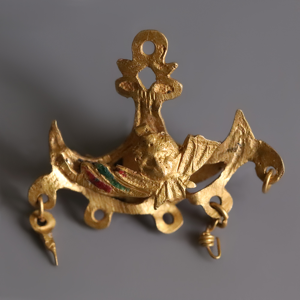A fine gold Elizabethan openwork, crescent-shaped pendant featuring a winged Putto. To its lower edge, the crescentic frame features five pierced lugs, three of which are embellished with dangling attachments formed from coiled wire and a single loop. The inner band features a winged putto mask to the centre, modelled with delicate facial features to indicate the eyes and nose. The wings are adorned with green and red enamelling, which would have decorated the whole piece. From the centre rises a slender attachment, with a four-sided star at the centre, connected to a pierced, circular loop.