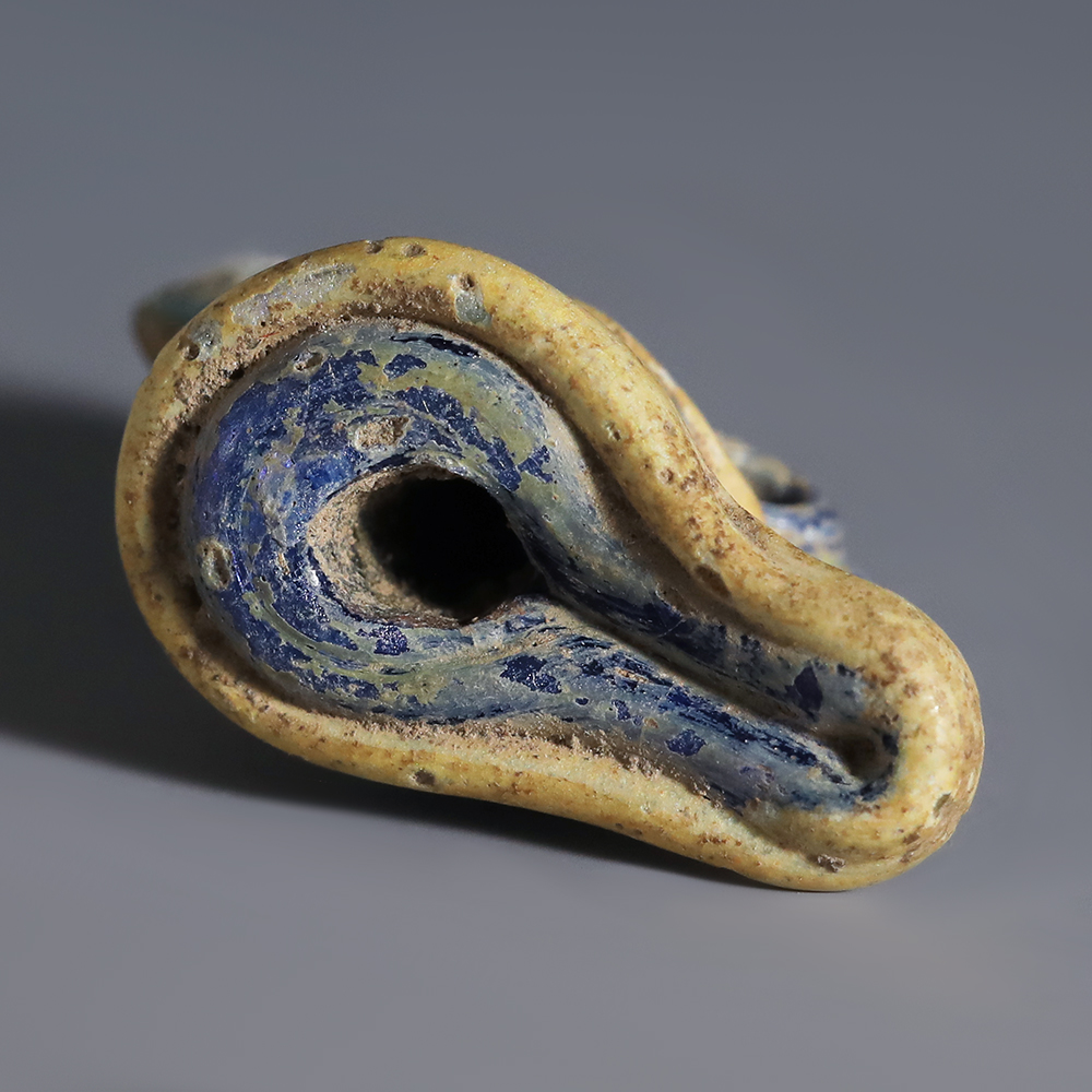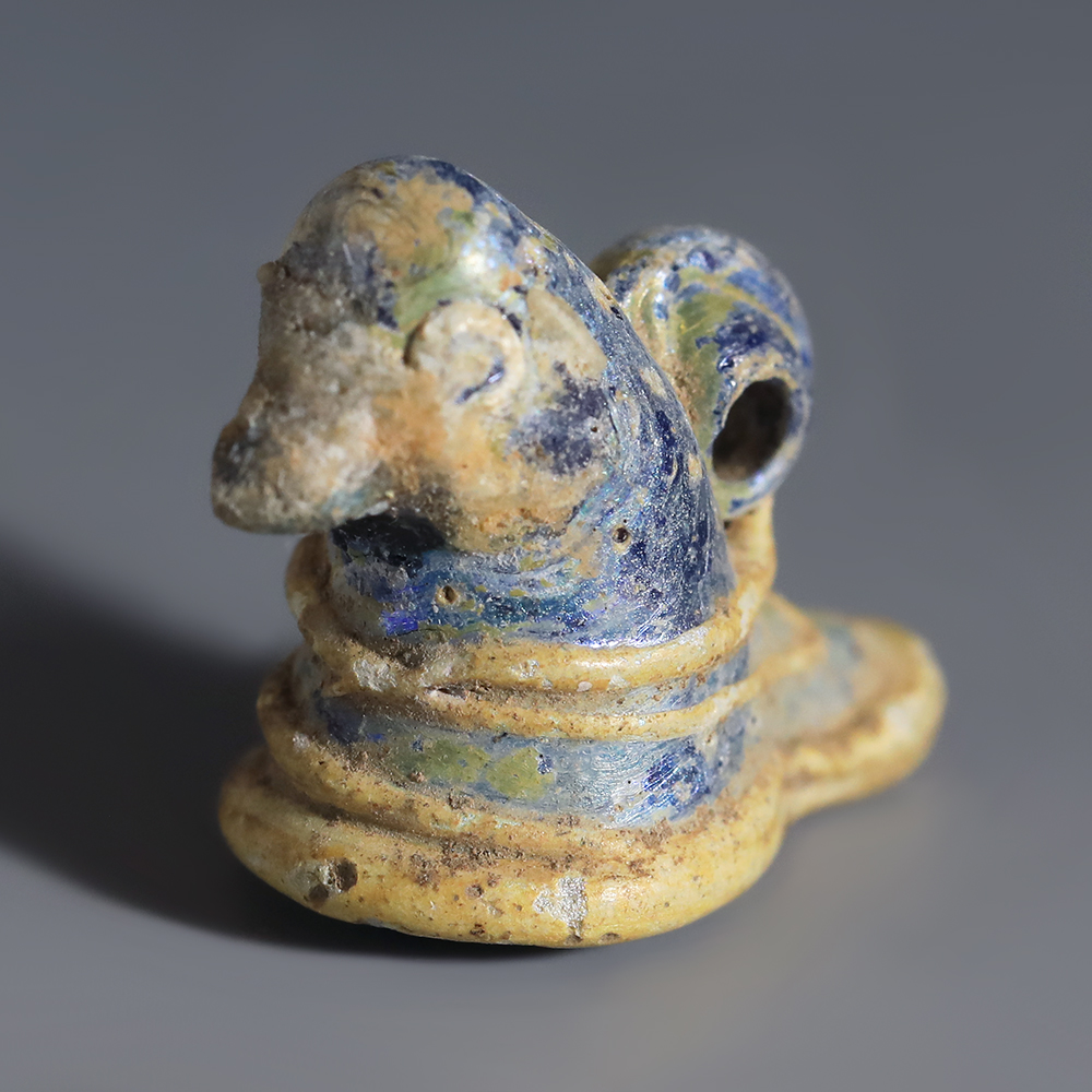 Rod-forming is a method of glass manufacture, developed from the earlier core-forming method originating in Mesopotamia in the mid 2nd Millennium BC. Instead of a central core attached to a metal rod, molten glass was worked around the tip of the rod itself. This method was mainly used for the production of small and narrow objects such as beads and pendants, like this fine example.