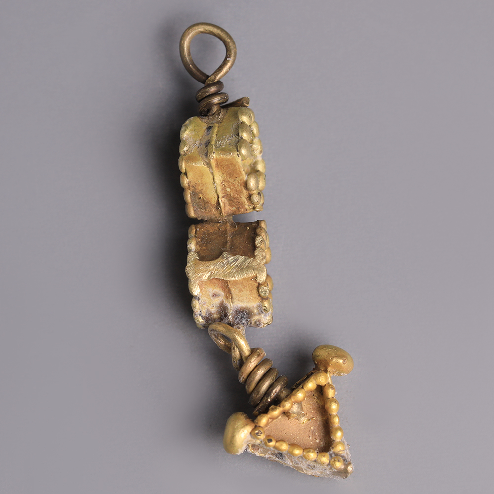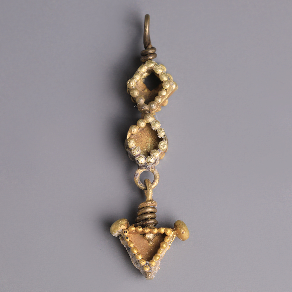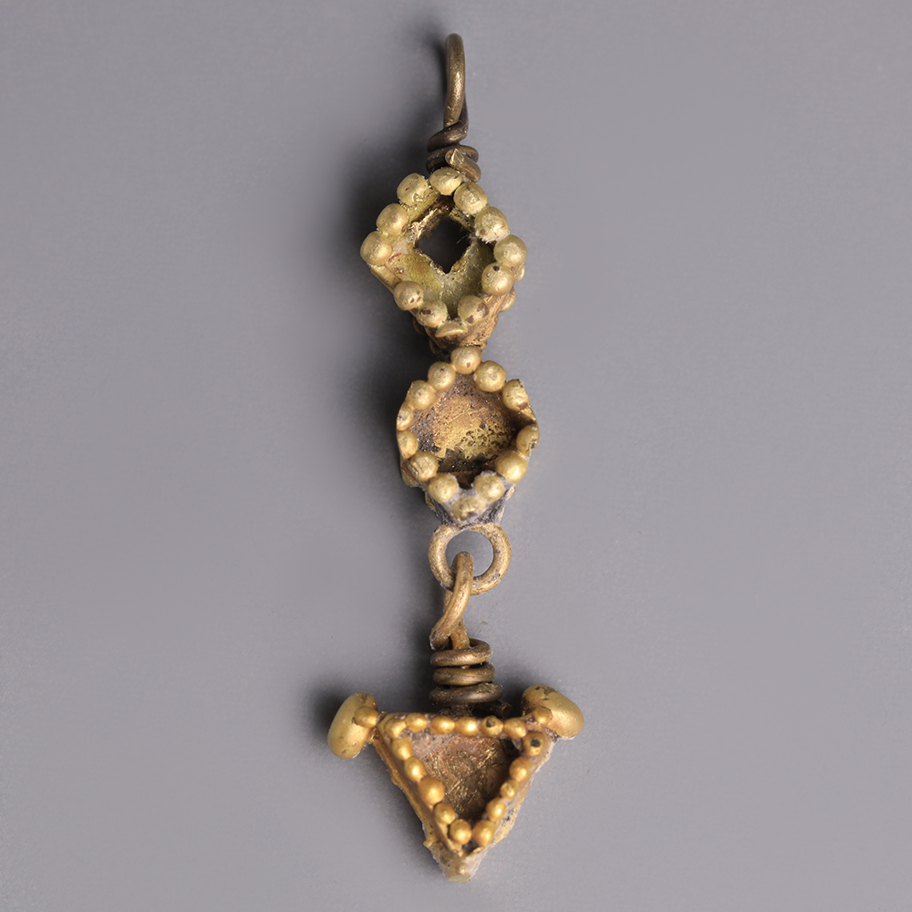 A Western Asiatic gold pendant, featuring a mirrored decorative design, repeated on both its front and back. The piece is comprised of two rhombic bezels arranged vertically with the top one presenting a pierced hole. A dangling triangular bezel with large gold granules decorating the corners (the lower one now missing) is attached beneath the rhombi. The bezels are embellished with gold granules around their perimeters. A loop is attached to the top of the pendant for suspension.