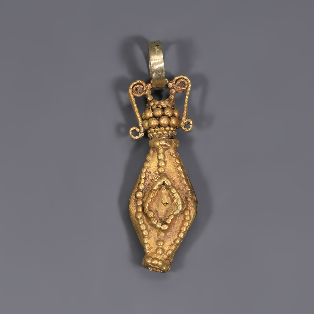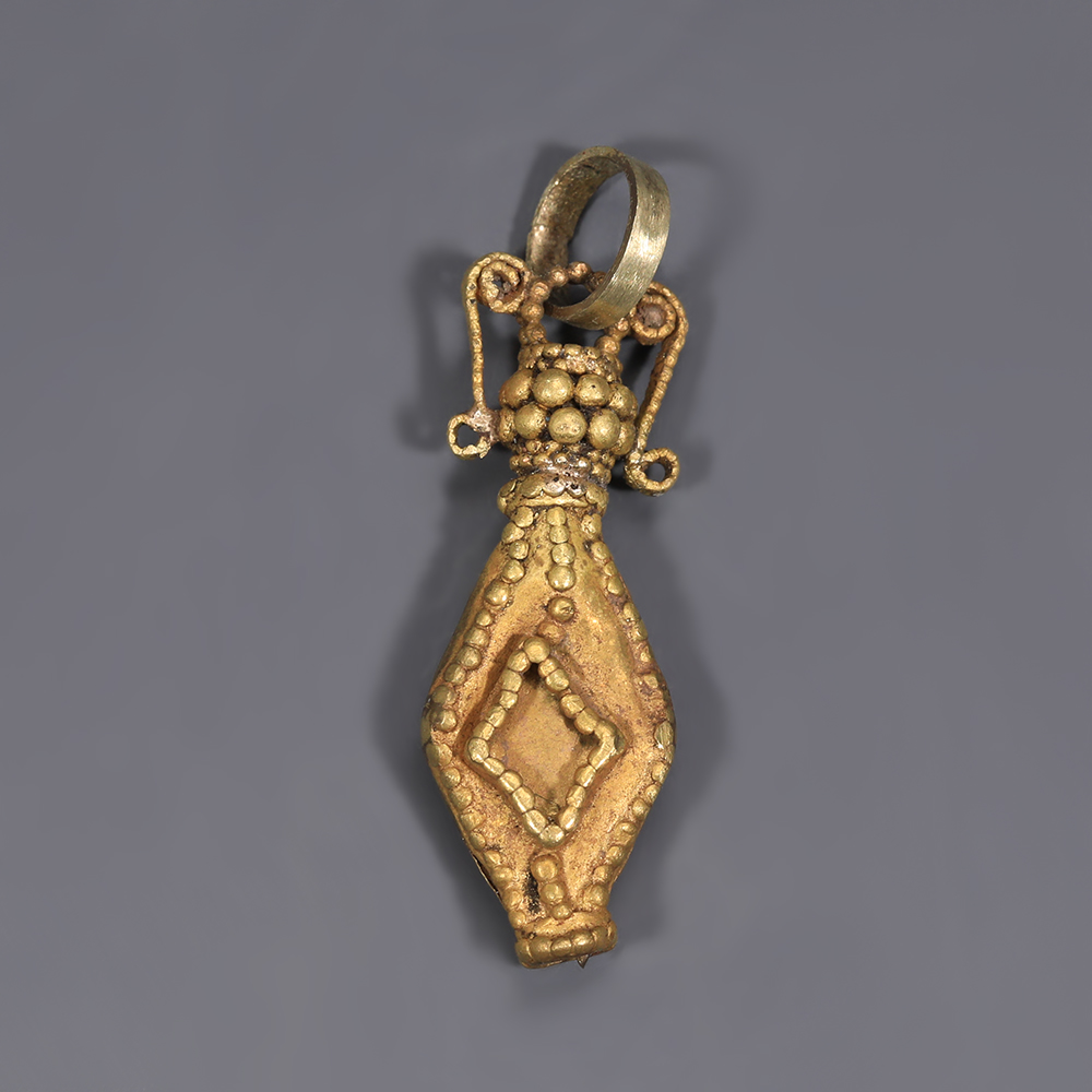 A Western Asiatic gold pendant with fine granulation. The body of the pendant displays a hollow rhombus shape with small circular elements at either end. Small granules decorate the perimeter and also form a smaller rhombus at the centre on both sides. On top of the rhombus is six bands of granulation of different sizes with an upright ring of granules above. A gold ring has been attached to the top, in antiquity, for suspension. Two gold rods have been curved to create a handle-like impression to the upper section of the pendant.