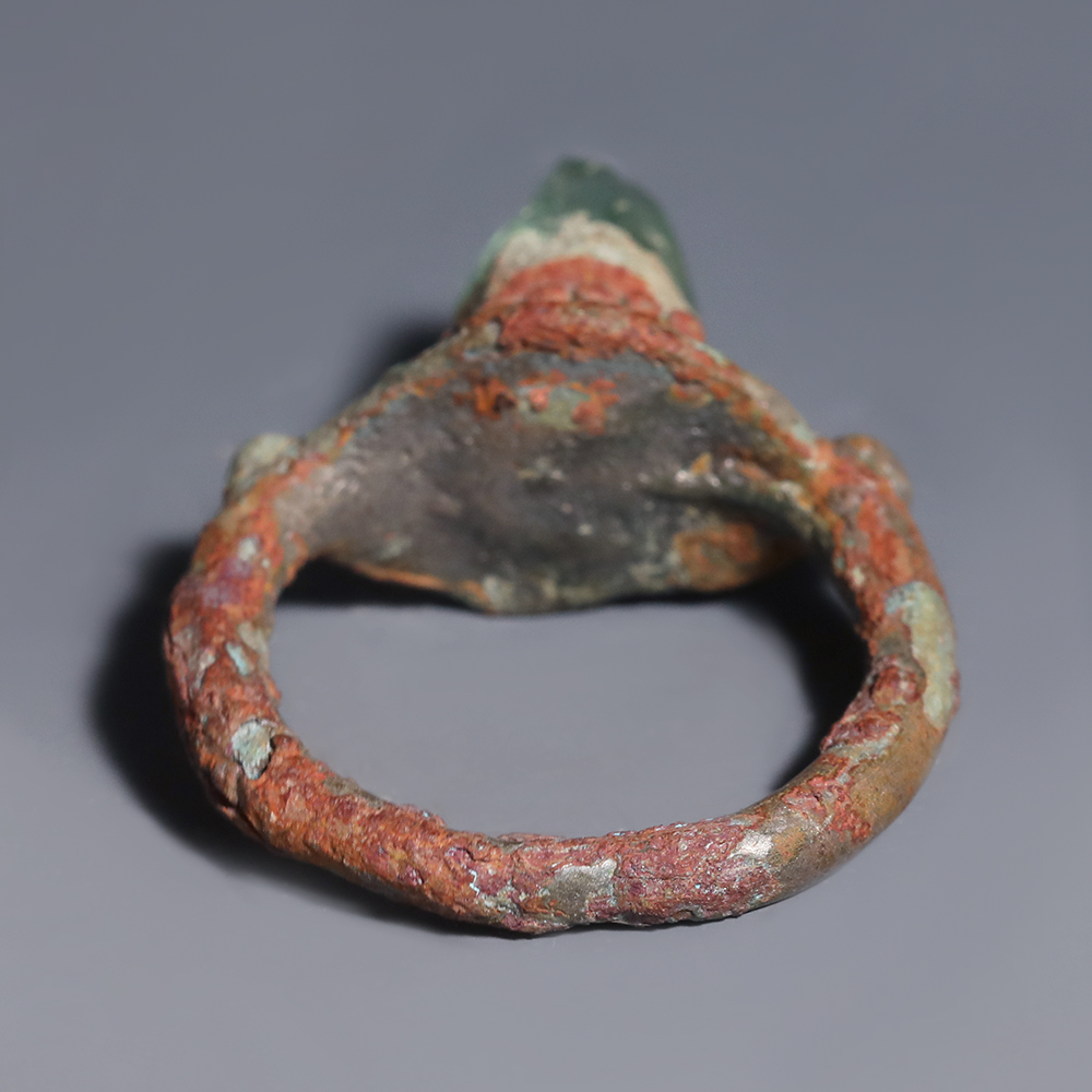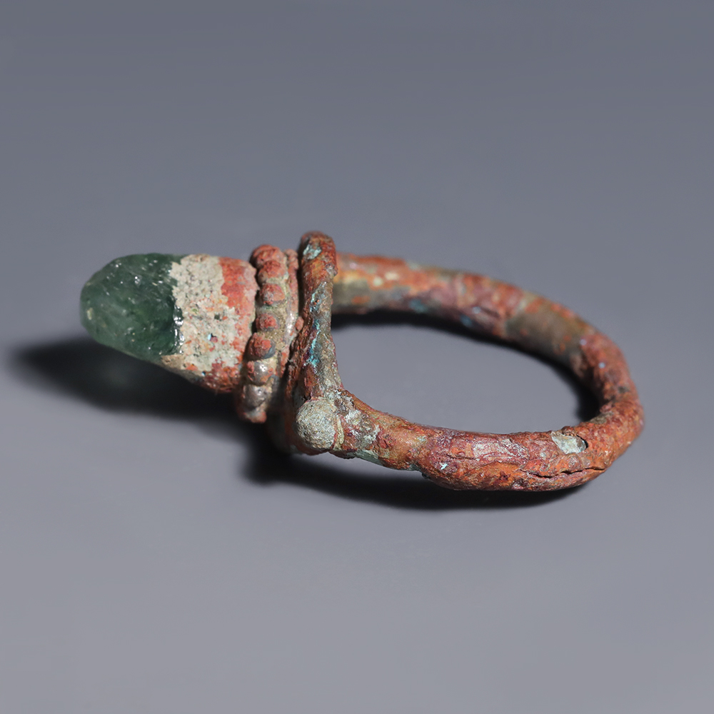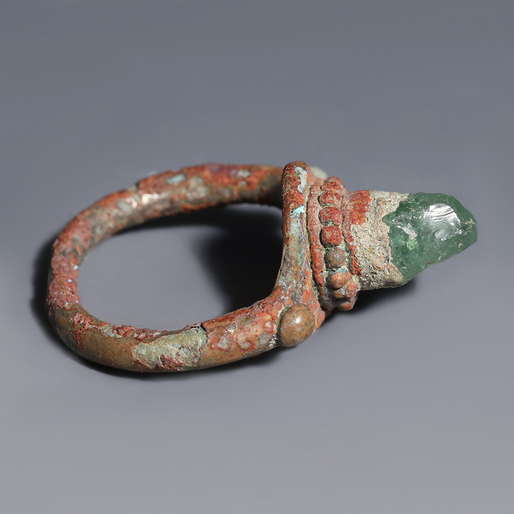 A Bactrian ring cast from bronze featuring a D-shaped band leading to an oval bezel. A large, protruding, green rock crystal sits at the centre held in place by a bronze frame. A band of bronze granules encompasses the semi-precious stone along with a small granule on each shoulder.