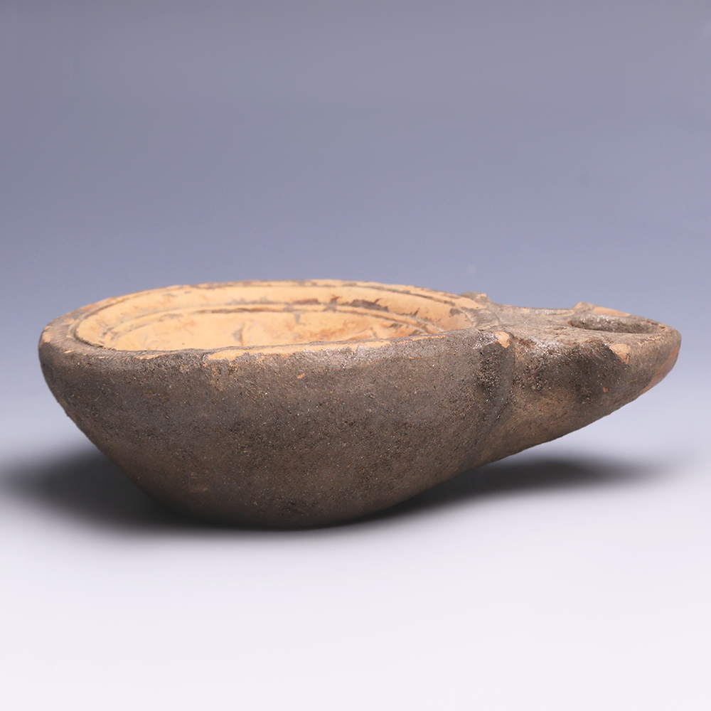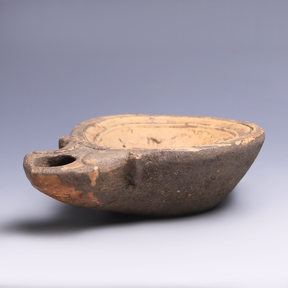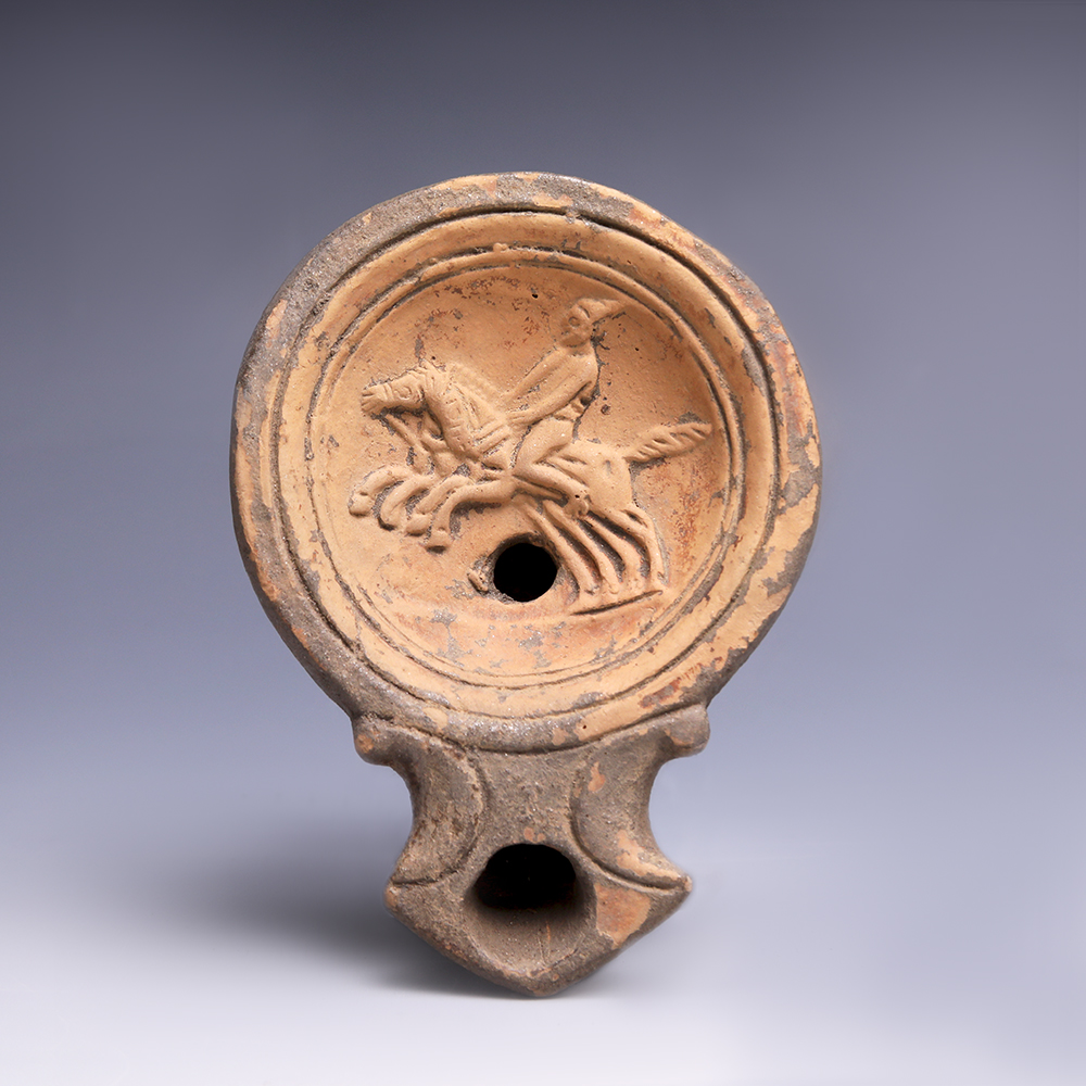 The Roman oil lamp, a product almost unparalleled in its distribution throughout the empire, developed towards the end of the Hellenistic period and was to keep its general shape longer than any other item of pottery throughout the Mediterranean. The vast trade networks set up with the expansion of the Roman empire allowed for this item to be spread across Europe, Eastern Asia and Northern Africa. Oil lamps were used by the Romans for mainly three reasons; to light private and public spaces, to give as offerings in temples to the gods and to be placed within a grave or funerary context. As well as linear, geometric and circular designs, favourite subjects for decoration of oil lamps included gods and mythological scenes, scenes from everyday life, gladiatorial depictions, drawings relating to entertainment and theatre, and various animals including fish, birds and horses.