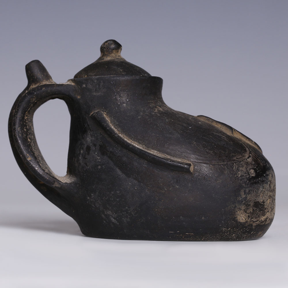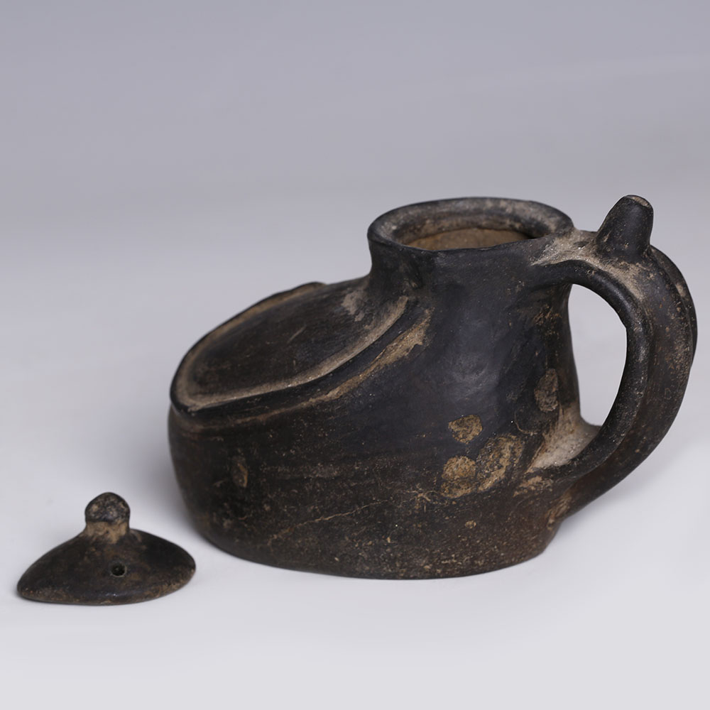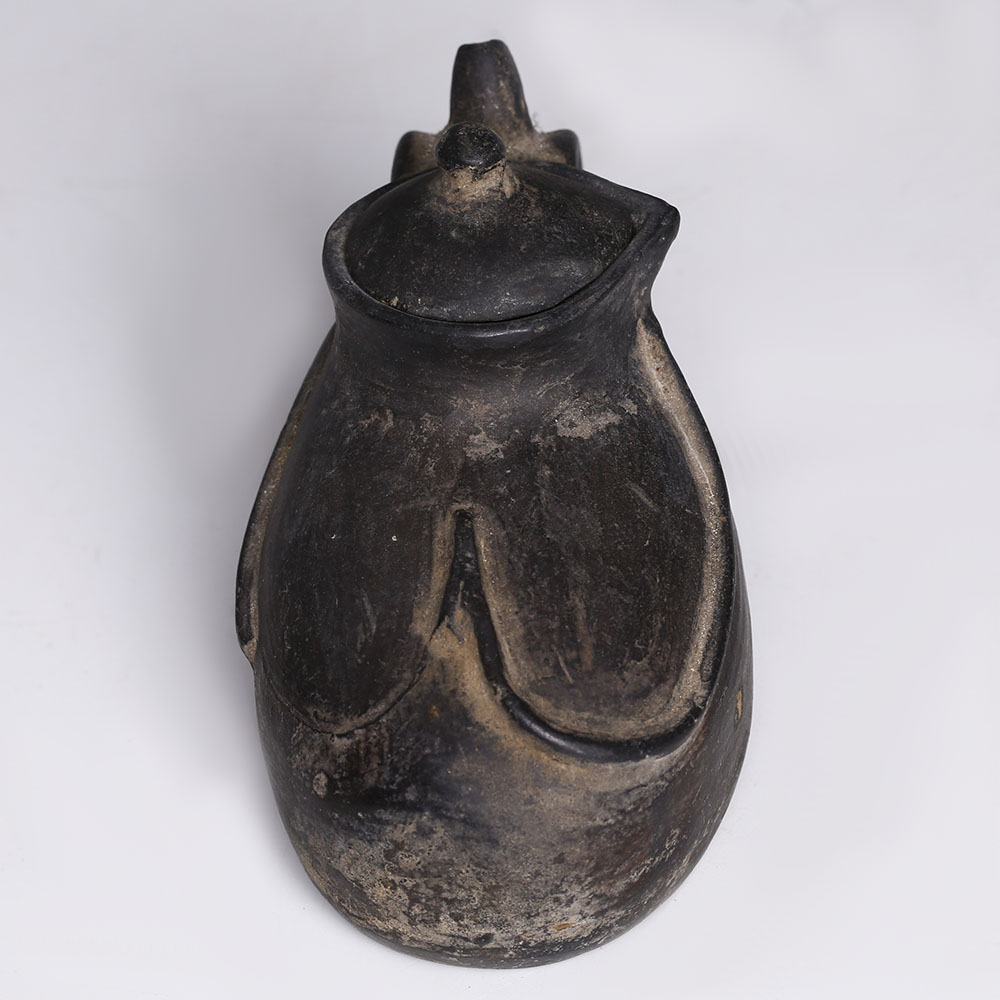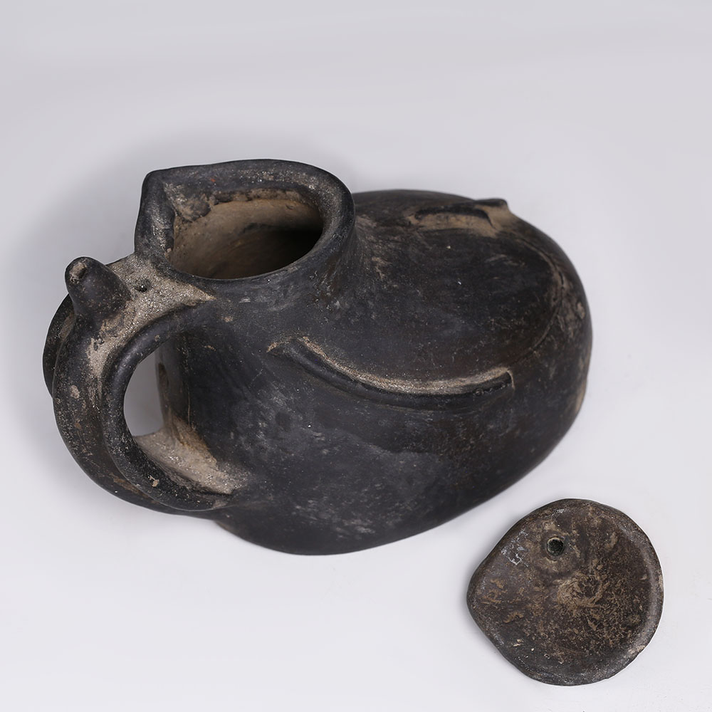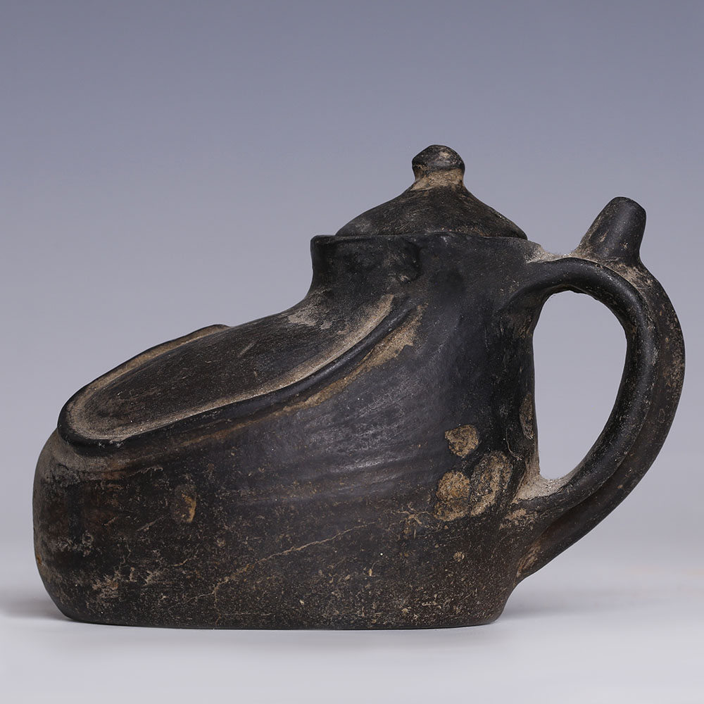 An extremely fine and well-preserved black-ware pot dating from the Chinese Longshan Culture period. The pot features a flat oval base, a single handle with thickened rims and central raised ridge ending in a top conical prick. The handle joins the body to the mouth, which is modelled with a pouring rim. One applied wire decorates the top of the vessel with a heart shape, part of it missing on one side. The item comes with its original lid.