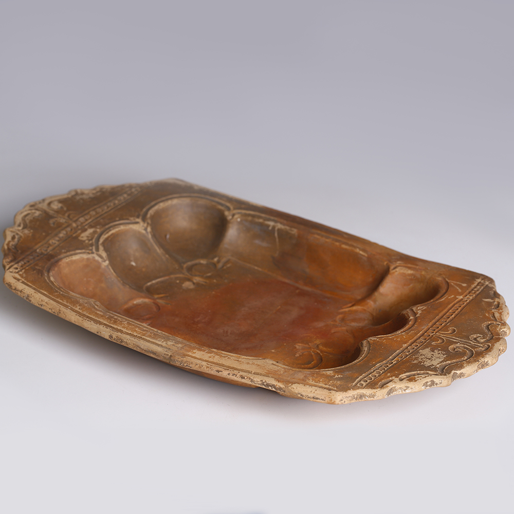 An extremely well-preserved Ancient Roman red terracotta, rectangular-shaped platter, known in Latin as lanx, featuring scalloped edges to the short sides. The centre appears concaved to contain food, most likely seafood such as oysters or mussels, judging from the shape. The platter is further enriched by incised scrolls and linear details.