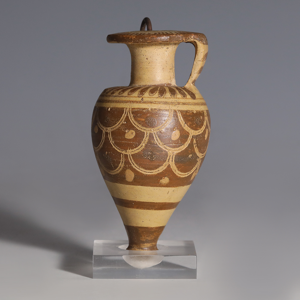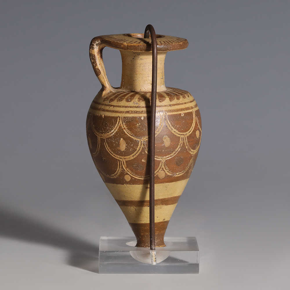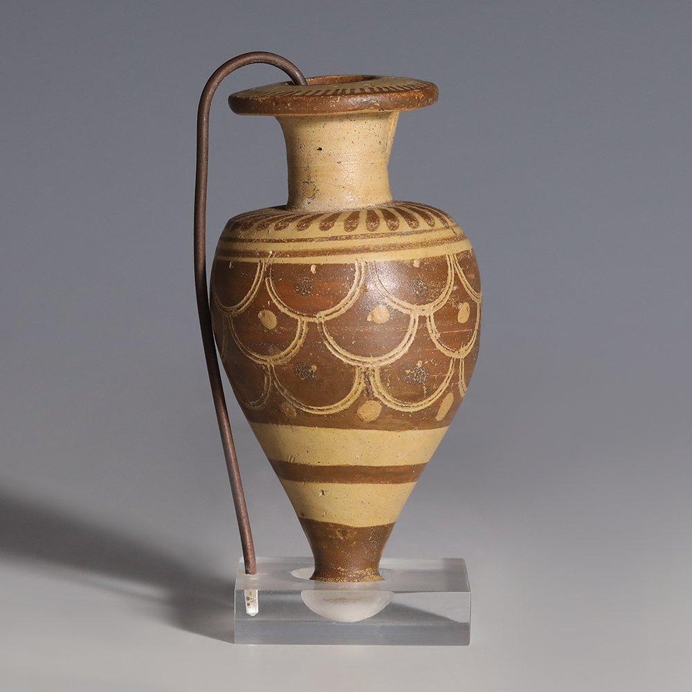 A fine, small terracotta aryballos featuring a globular body which tapers in to slight point with a circular base. The shoulders sharply narrow in to a short, cylindrical neck. The rim is outsplayed and flattened to make a large circle. A single handle has been applied from the rim to the shoulder. The body is enriched with bands in a dark pigment of various sizes. The larger central band displays a scallop design with pale cream dots, some now missing. Short, slightly slanted lines encompass the rim which is mirrored on the shoulder but with thicker lines. The aryballos has been mounted on a custom-made stand.