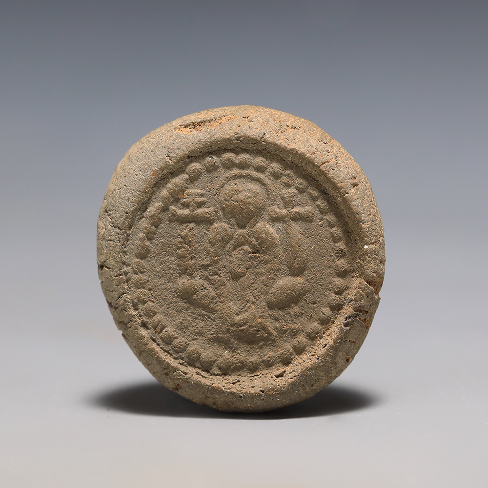 A fine terracotta pilgrim token representing the Virgin and Child. The token is circular in shape with an irregular domed back. The flat obverse is impressed with an image of representation of the Virgin, nimbed and enthroned between two small Latin crosses holding the infant Christ on her lap. A granulated frame surrounds the image. The obverse is undecorated but features fingerprint impressions, reflecting the handcrafted nature of the token.