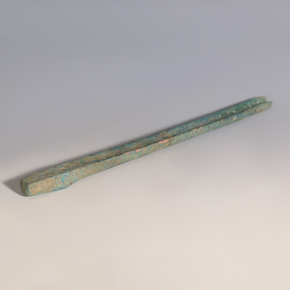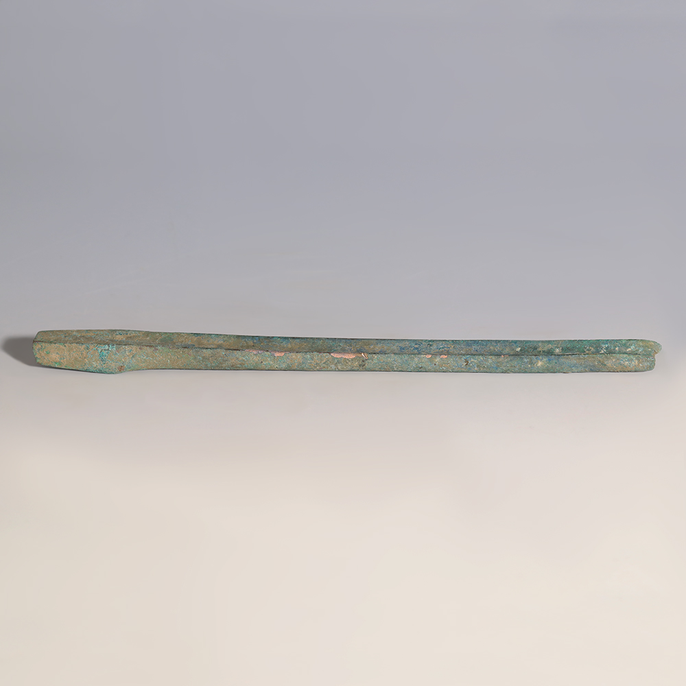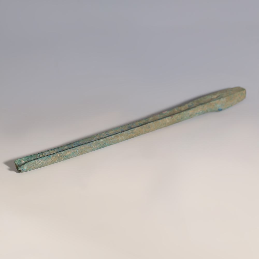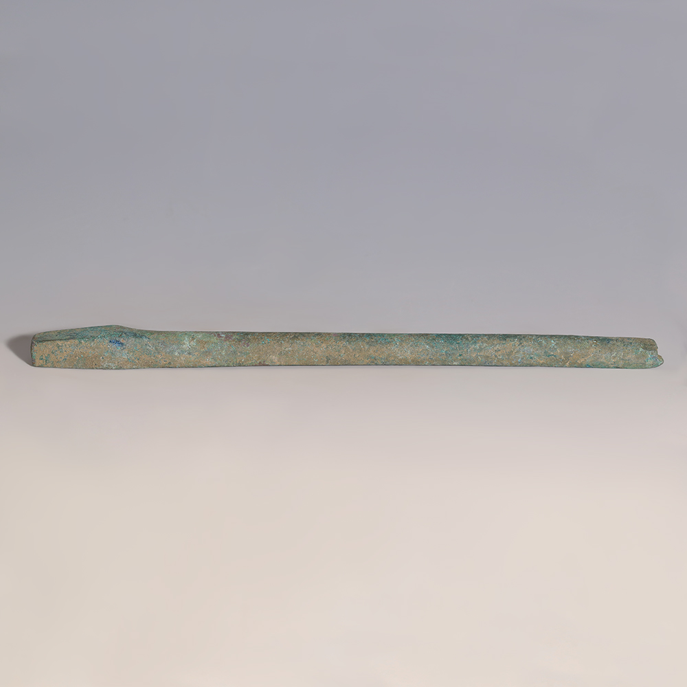 A long Bronze Age gouge chisel. The cast bronze tool has a short semi-circular shaft that seamlessly transitions into a blunt square-section butt which served as a handle. The gouge end, unfortunately now chipped off, would have been sharper and curved, with a narrow channel running from the end to the handle part of the chisel. Patination and earthly encrustation is visible across the surface.