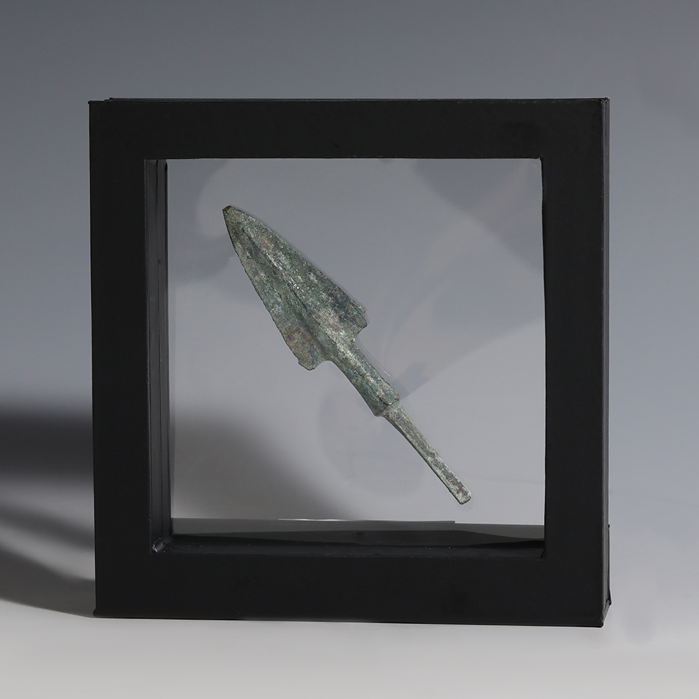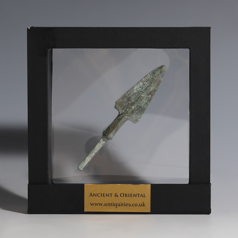 A finely cast Luristan bronze arrowhead featuring a triangular blade with square shoulders. The prominent central midrib leads to a short stem and a narrow tang for fitting onto the wooden shaft. The arrowhead is fitted in a custom frame.