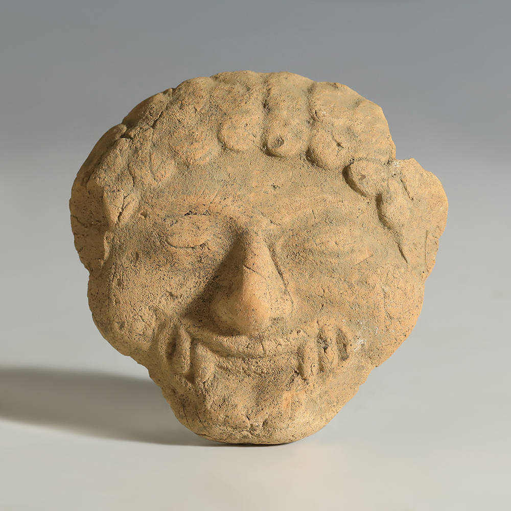 A fine, Ancient Greek, terracotta Gorgoneion fitting. The face is moulded to depict the gorgon with her wide mouth stretched in a grin with two long tusks protruding above and below, and her tongue thrust out. The figure’s cheeks are puffed out, and the forehead is partly covered with a fringe of tight curls. The reverse is flat and unworked.