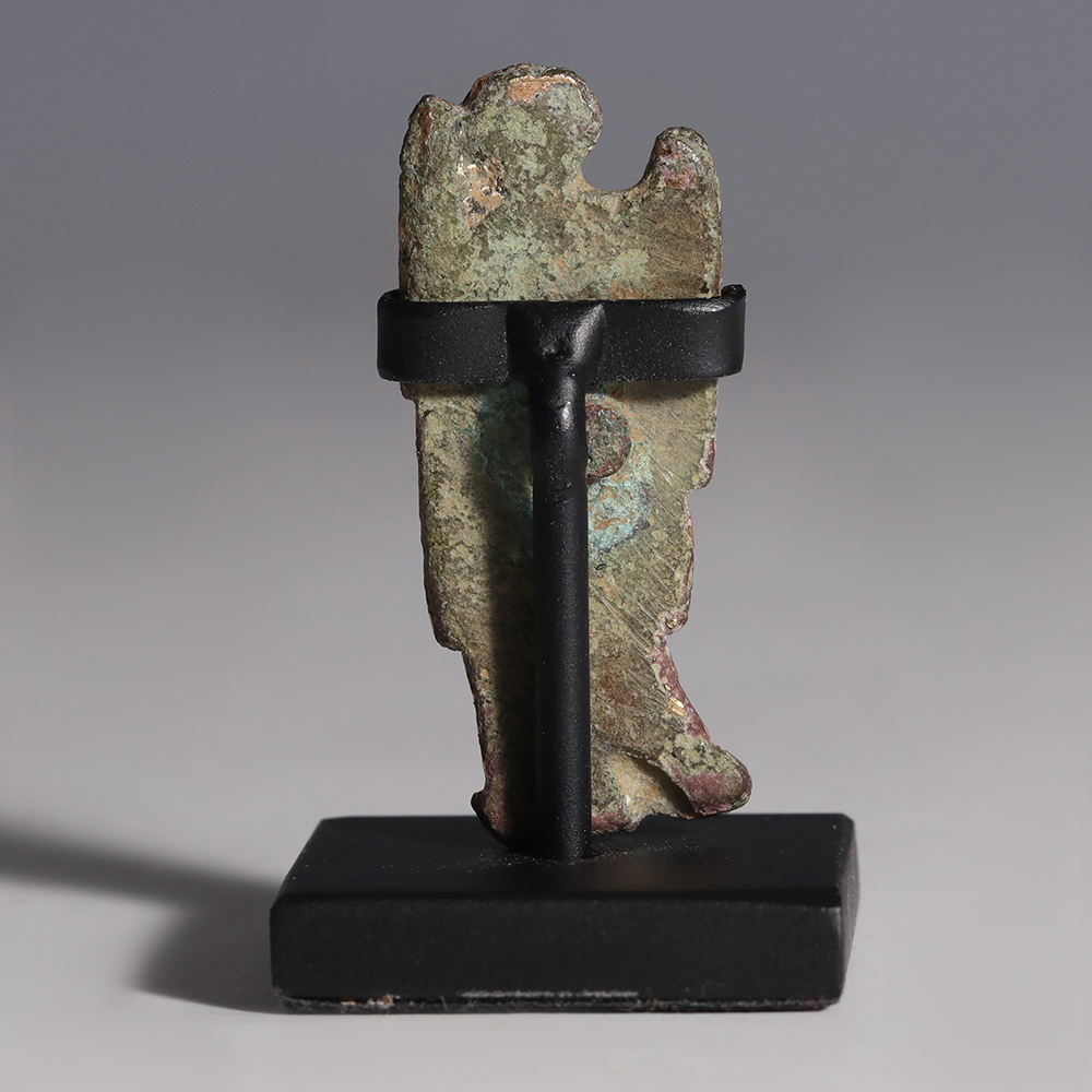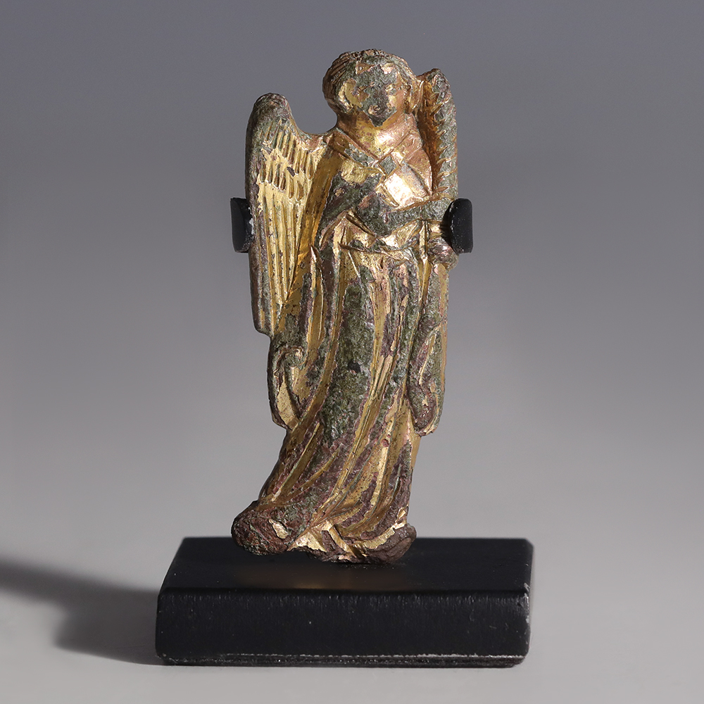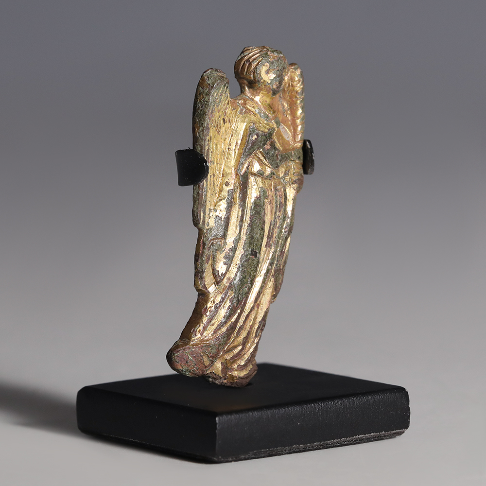 A fine Medieval angel mount with the front gilded in gold. The angel is presented facing forward, dressed in a long robe with incisions indicating the folds in the material. He holds a large candle adjacent to his left shoulder. A large wing is visible over his right shoulder. Vertical incisions are used to mimic feathers. A small protrusion extends out from the reverse used for mounting. This piece has been mounted on a custom-made stand.