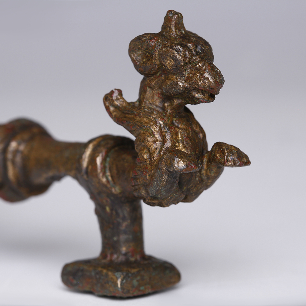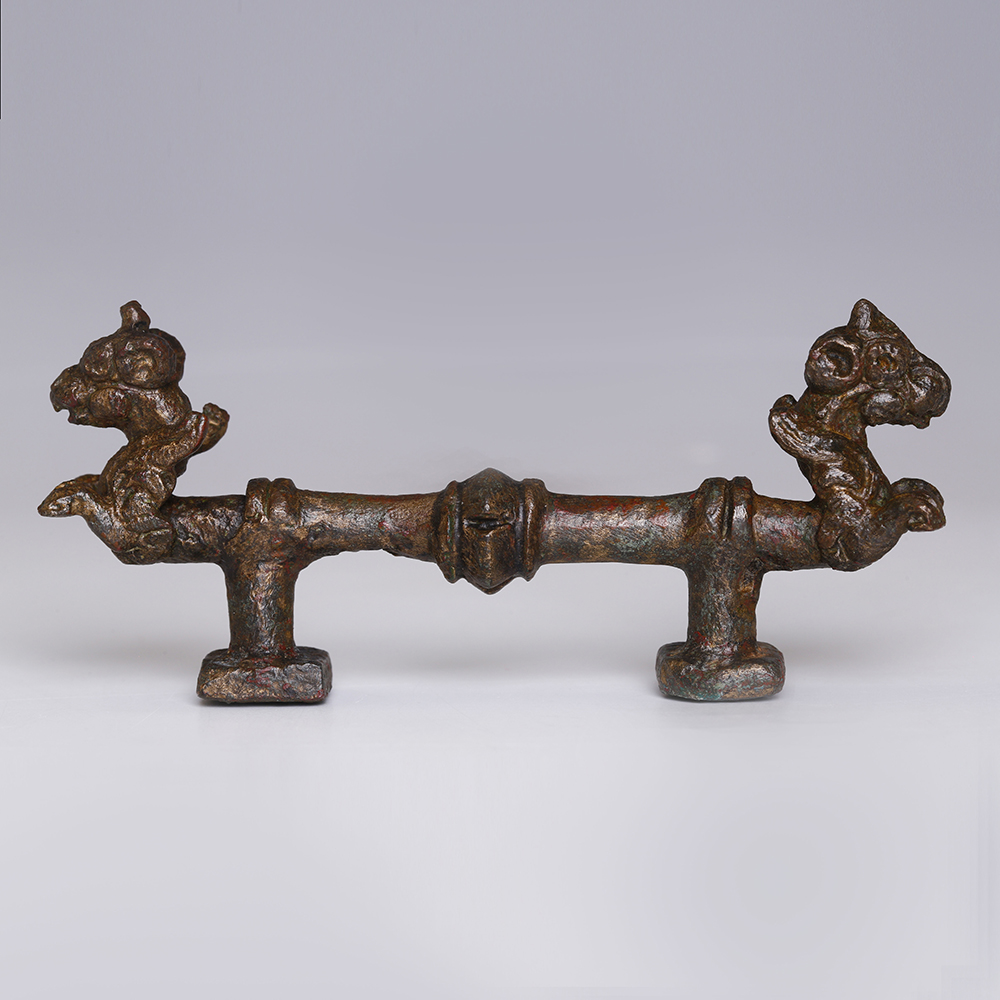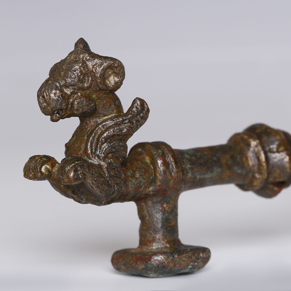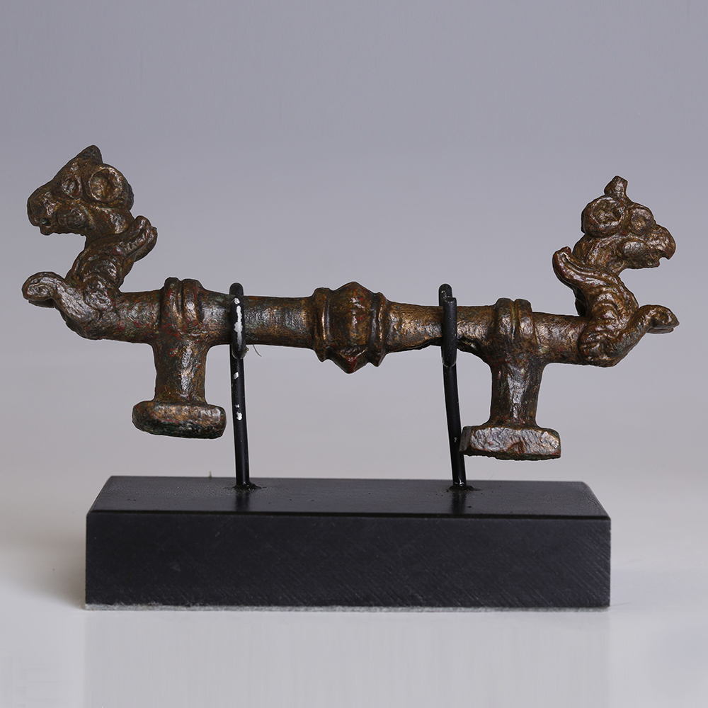 A finely modelled Near Eastern bronze horizontal handle, originally part of a mirror. The handle is formed by a cylindrical pole, terminating in the foreparts of two leaping griffins, emerging from a folded collar at each end of the pole. Beneath each collar a pedestal, featuring a squared-base and a short cylindrical basement, supports the pole. These two pedestals would have been attached to the mirror. The griffins reflect the typical Near Eastern stylistic manner of rendering zoomorphic creatures, with deep carvings suggesting facial and anatomical features.