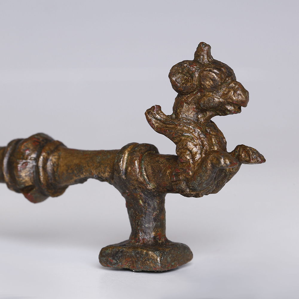 Mirrors were used in antiquity not only as an essential toilette piece but were also associated with funerary and ceremonial rituals, hence their frequent occurrence in archaeological excavations of ancient cemeteries. Mirrors featuring a horizontal handle, such as this fine example, are relatively rarer compared to the standard mirrors with vertical grip. Horizontal handled mirrors appeared after the 1st century AD, lasting until the 10th century AD, being widespread across all the Roman Empire and the Eastern regions. Handles of such mirrors excavated in territories of the Roman Empire would have been modelled in the shape of stylised fingers or Herakles knots, while same mirrors in the East and Near Eastern regions, features zoomorphic figures, such as griffins. Horizontal-handled mirrors are less numerous in the East regions, however are much more geographically widespread, being recovered in territories of the Parthian, and later Sassanian, Empire, Central Asia and Vietnam. Interestingly, no horizontal-handled mirrors have materially survived from Kushan India, however, different Mathura sculptures and reliefs show figures holding this type of mirrors.