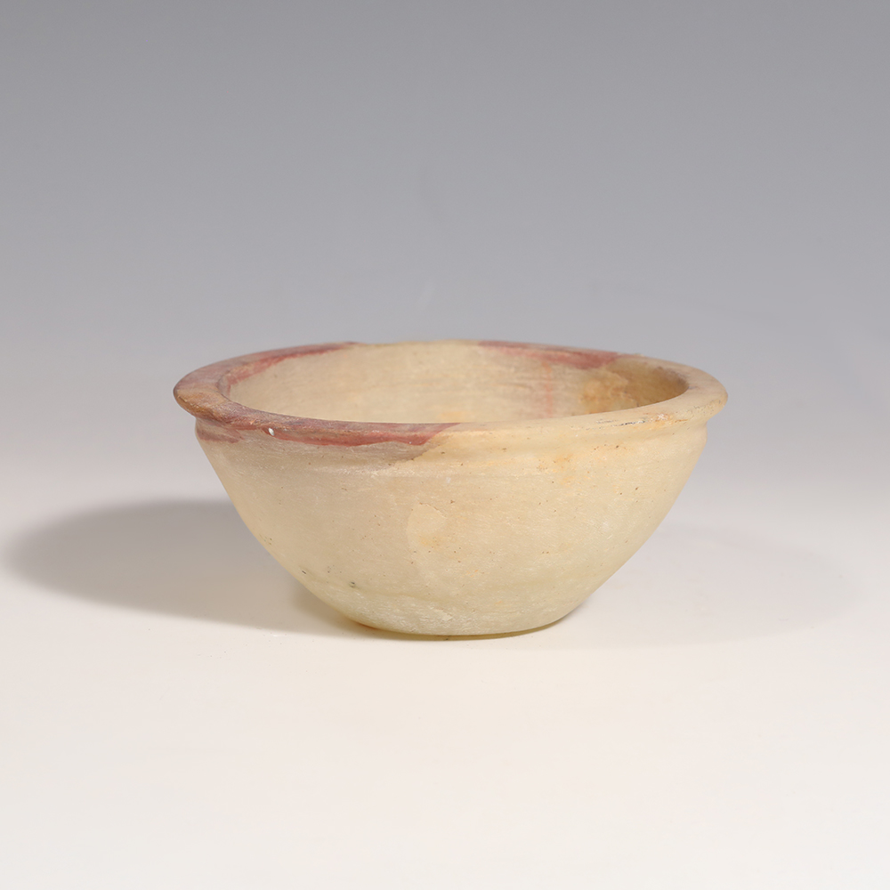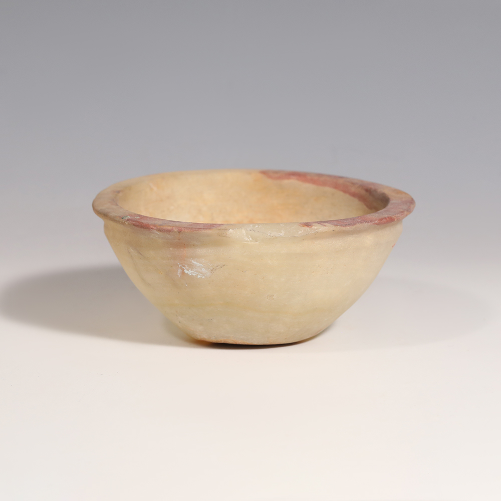 An ancient Egyptian alabaster carinated bowl. The vessel consists of a flat base and gently curved walls ending with a carinated shoulder. This leads to a flattened rim. which displays the varying colours and hues of veined alabaster. The varying shades of natural cream, brown and red display ancient Egypt’s fine alabaster craftsmanship.