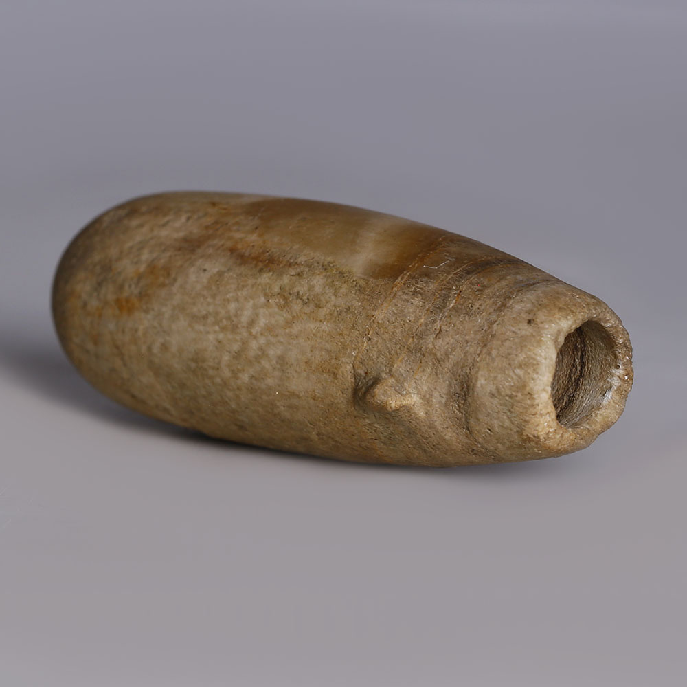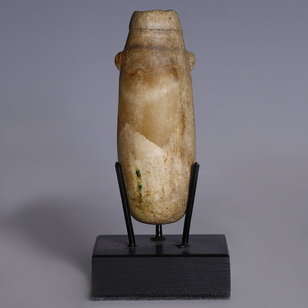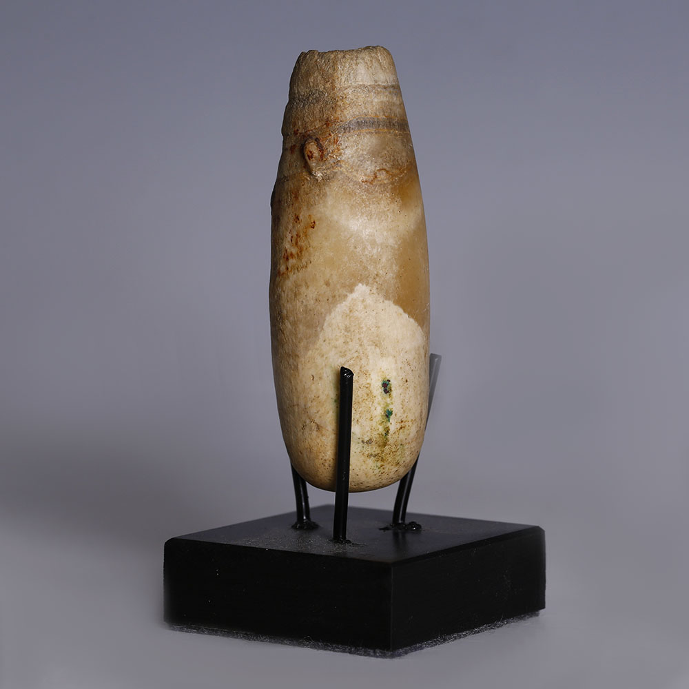 An Egyptian alabastron, a cosmetic bottle made in the homonymous alabaster stone, used in Antiquity for storing ointments. The long cylindrical body, expanding in the central section and then narrowing again towards the top and bottom, features two small lug handles to the sides and an irregular rim to the top. A lid would have originally been part of the bottle, keeping any liquids stored inside fresh for use.