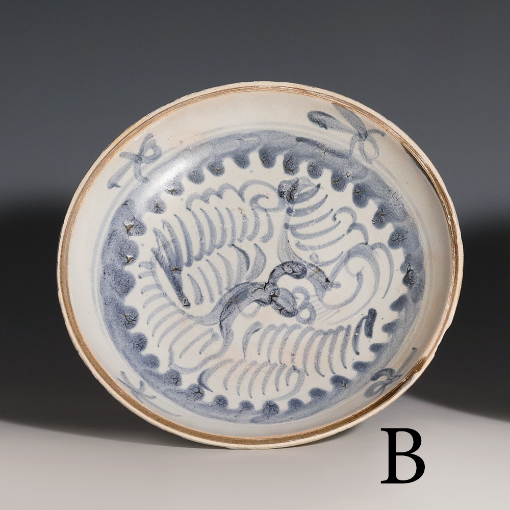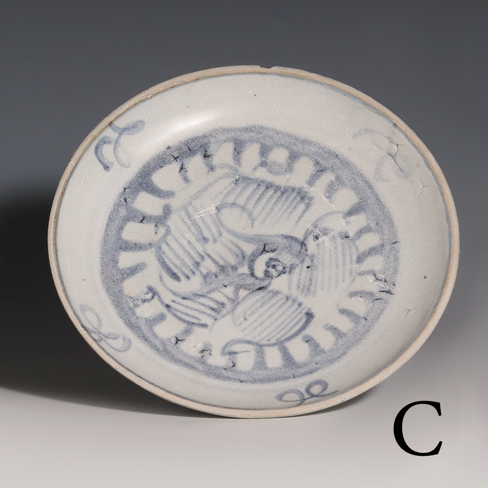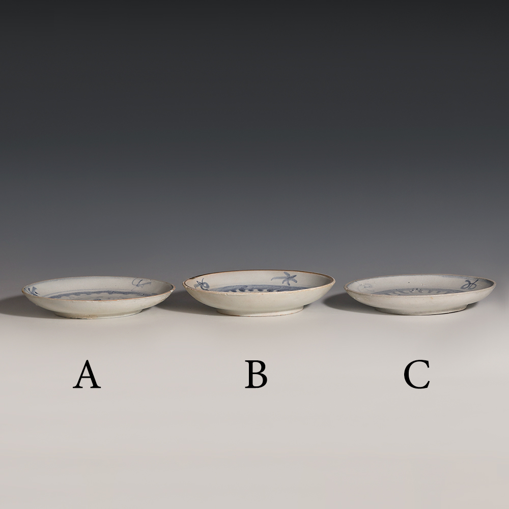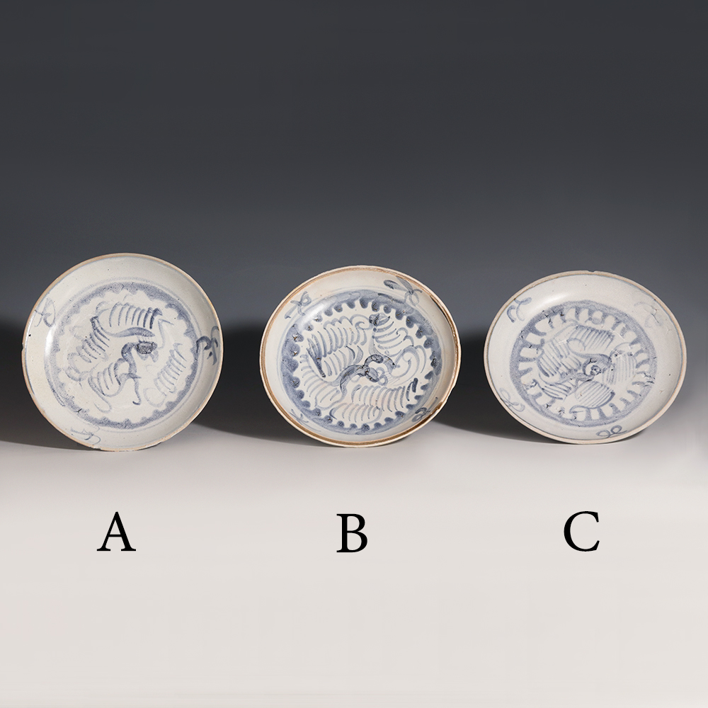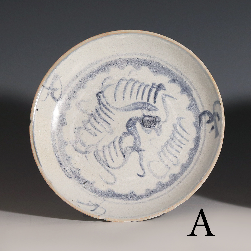 A selection of Tek Sing porcelain plates displaying different hues of underglaze blue pigment. The plates have been decorated with a stylised phoenix bird enclosed with in a band of waves. Four stylised flower sprays feature around the rim except for A which has three.